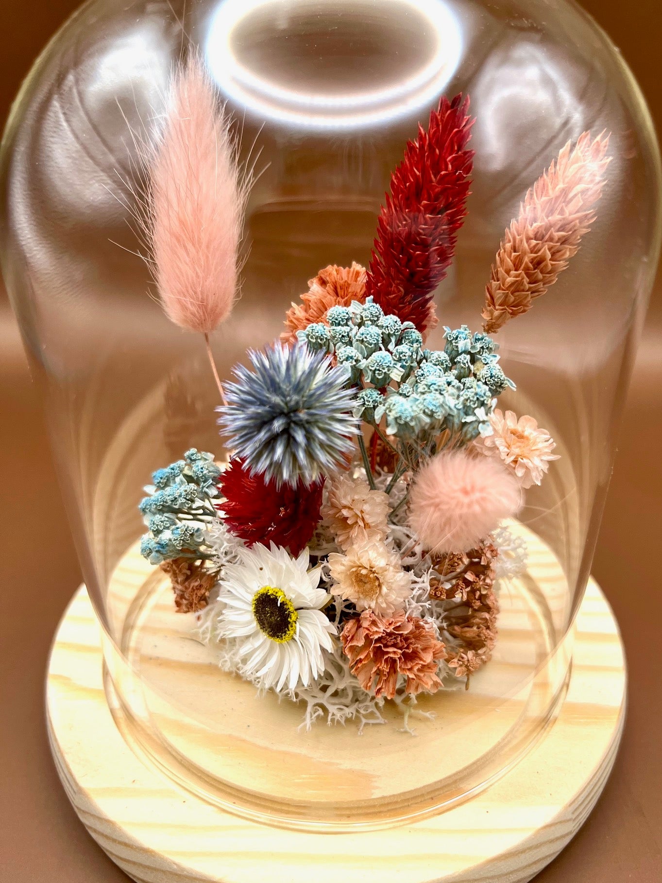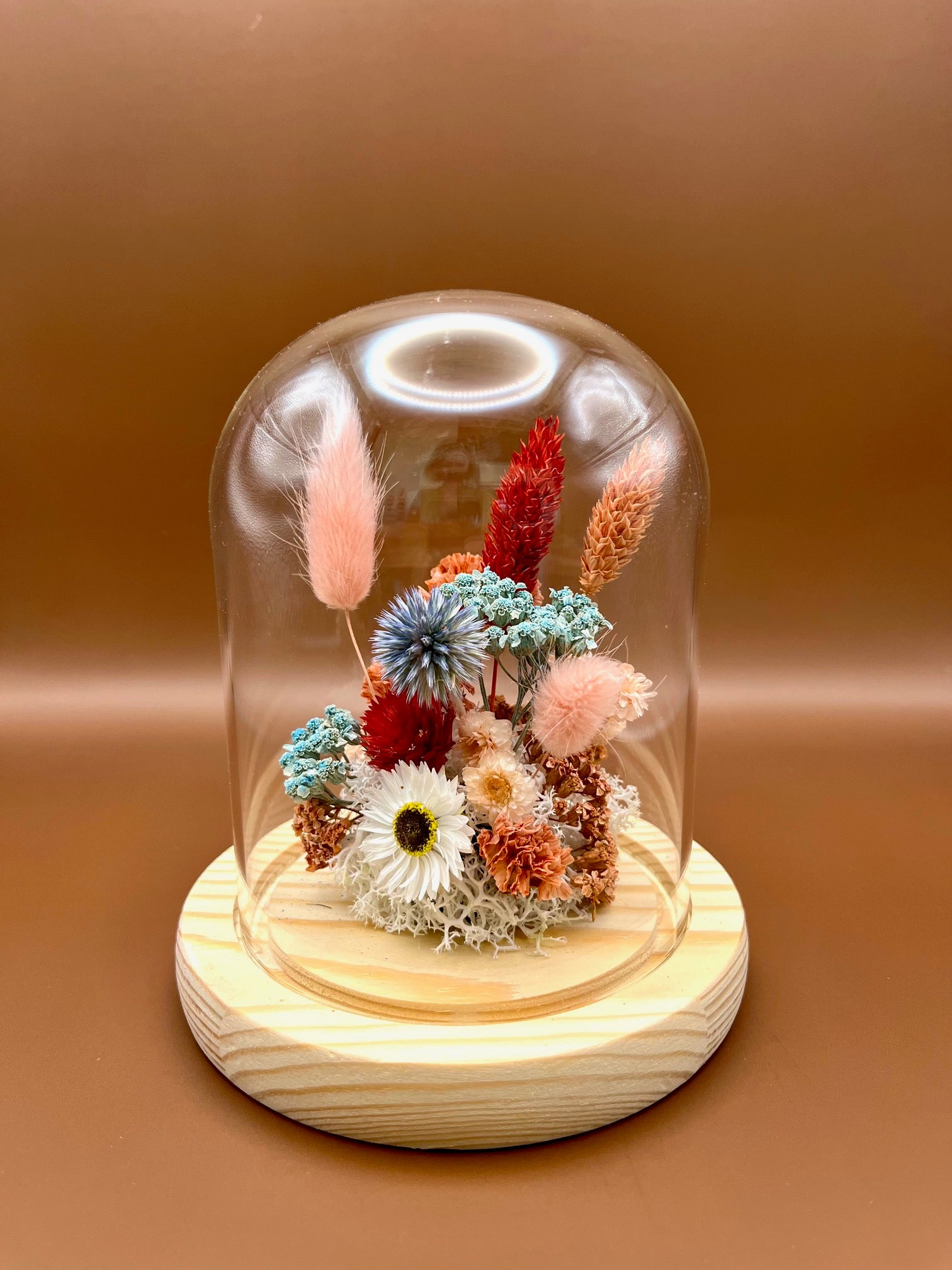 Cette cloche en verre, ornée de fleurs et feuillages séchés dans des tons roses et bleus. Elle apportera une touche de douceur et de gaieté à votre intérieur, tout en célébrant la beauté de la nature.