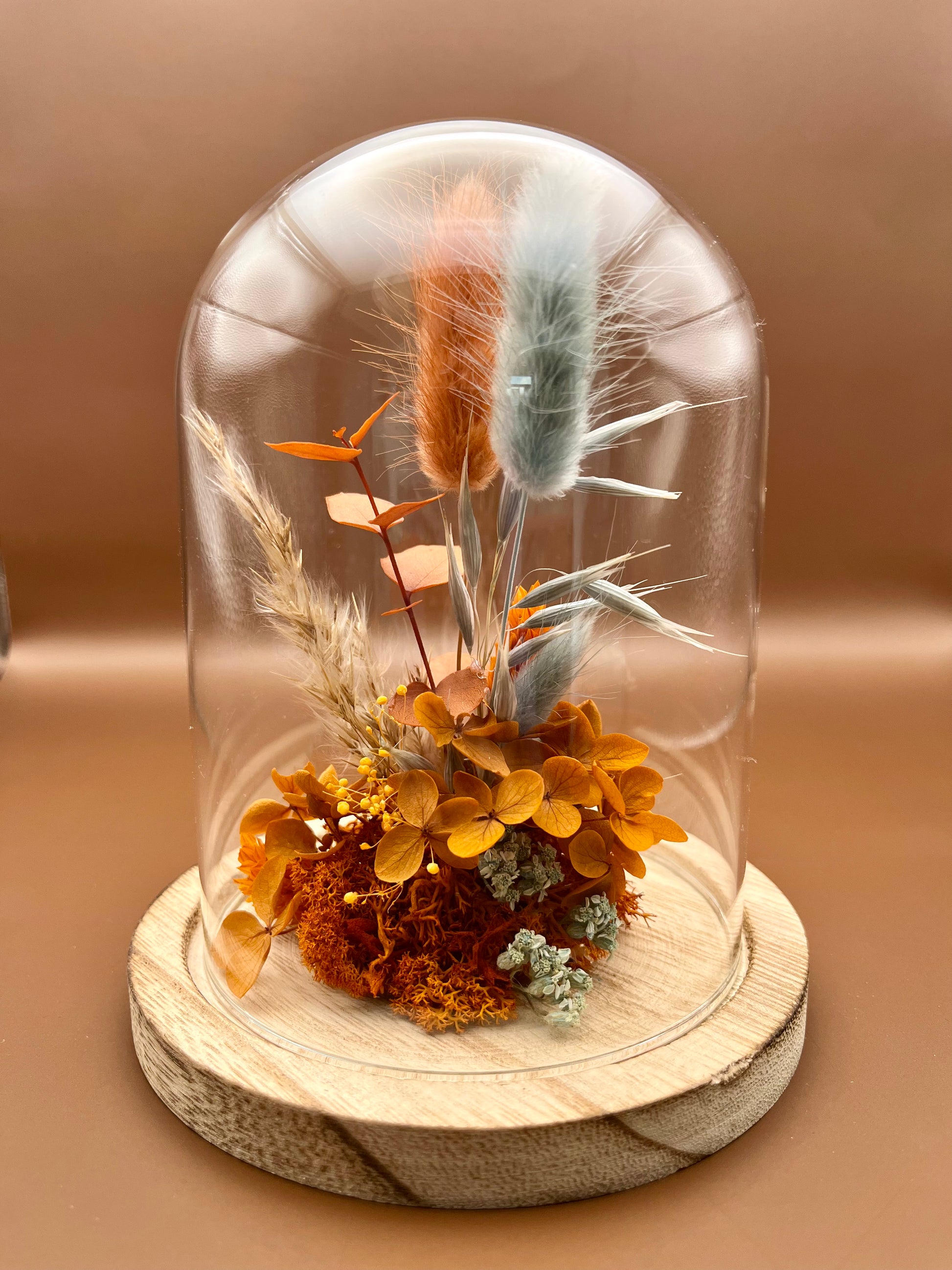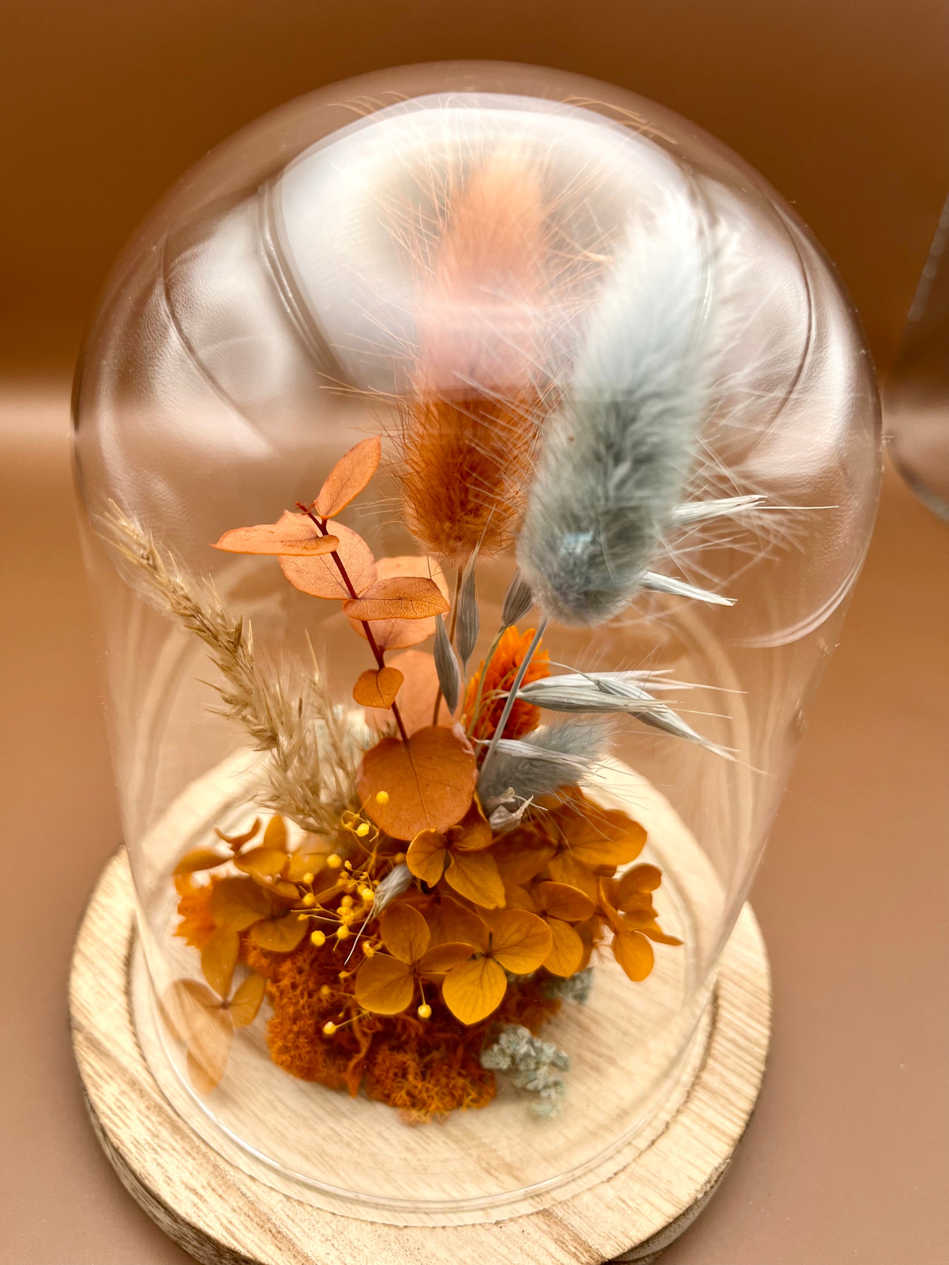 Cette cloche en verre, ornée de fleurs et feuillages séchés dans des tons chaleureux. Elle apportera une touche de douceur et de gaieté à votre intérieur, tout en célébrant la beauté de la nature.