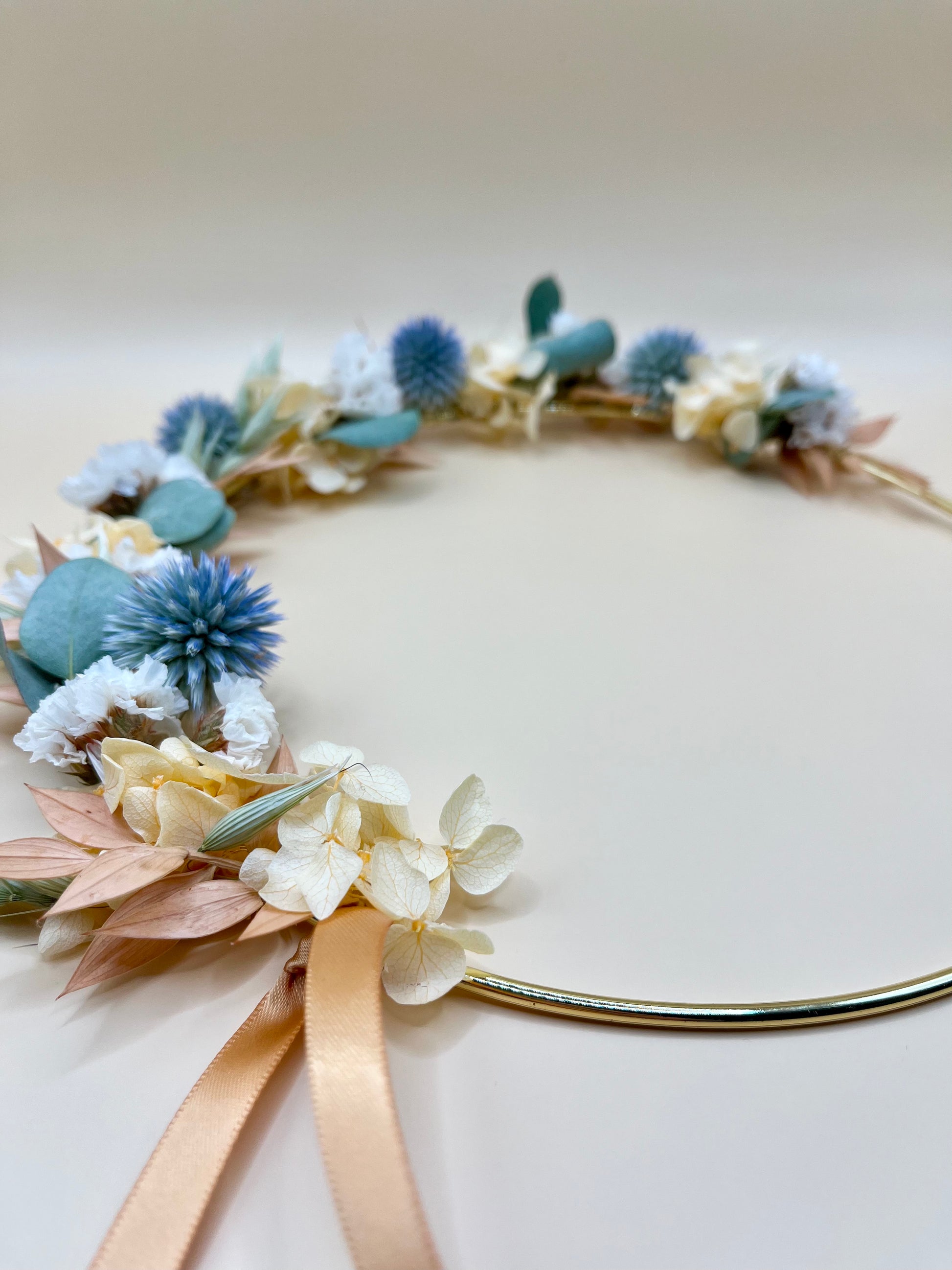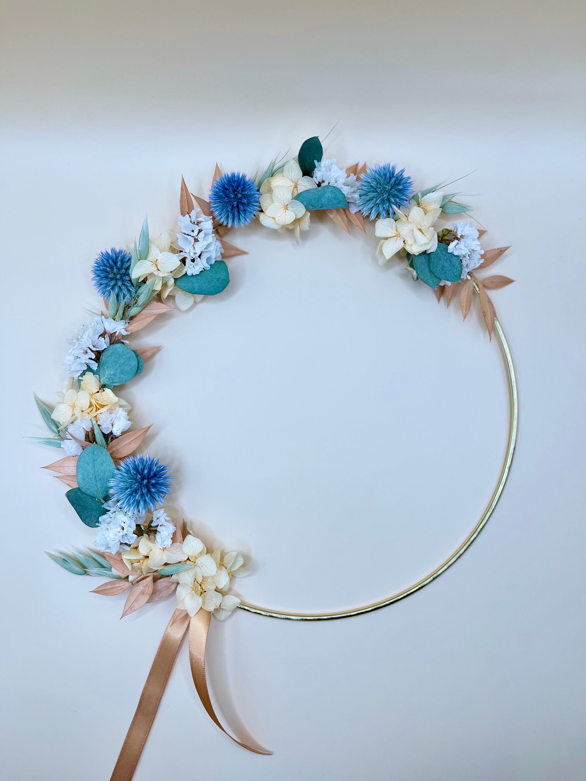 Cette couronne mural en laiton délicatement fleurie, est ornée de fleurs et de feuillages séchés dans des tons doux de bleu et de rose.