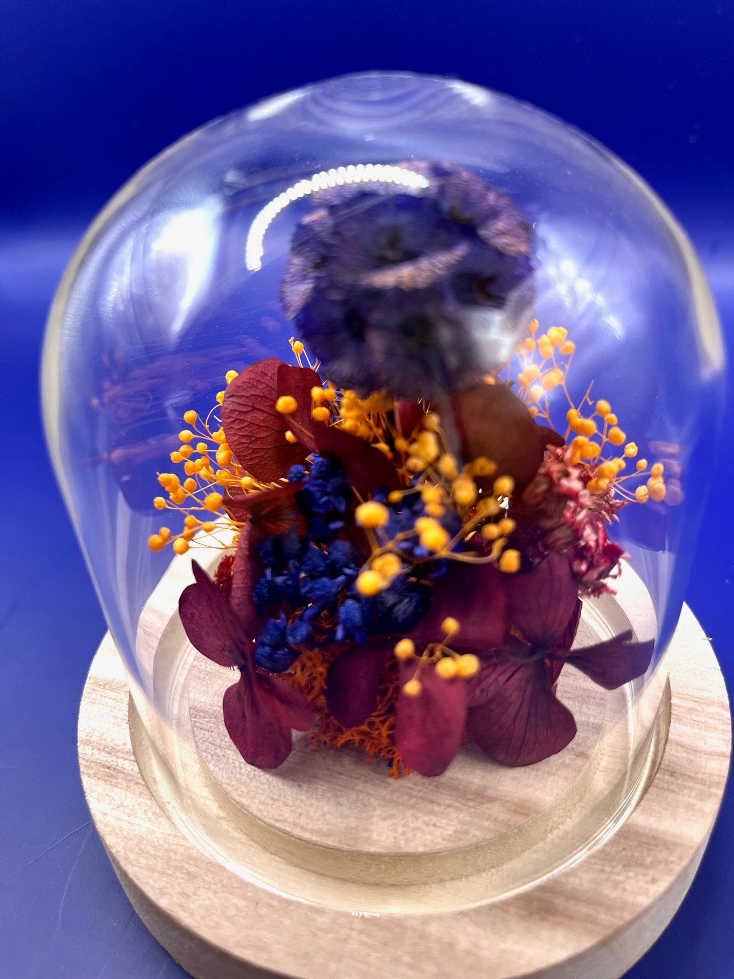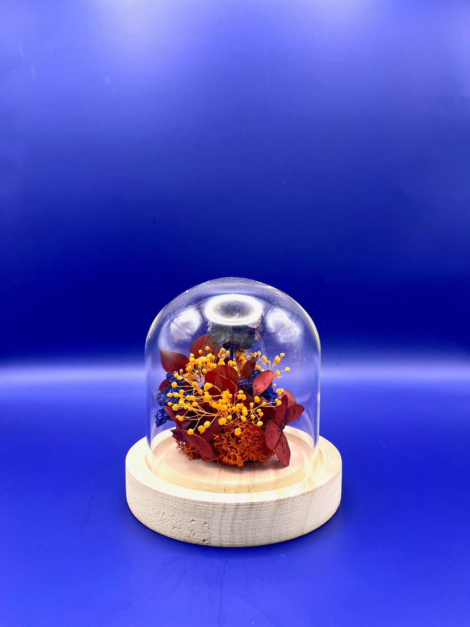 Cette cloche en verre, ornée de fleurs et feuillages séchés dans des tons chaleureux. Elle apportera une touche de douceur et de gaieté à votre intérieur, tout en célébrant la beauté de la nature.