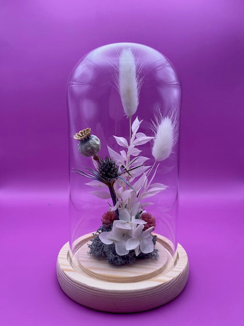 Cette cloche en verre, ornée de fleurs et feuillages séchés dans des tons pastel. Elle apportera une touche de douceur et de gaieté à votre intérieur, tout en célébrant la beauté de la nature. Chaque pièce est soigneusement réalisée à la main avec amour dans mon atelier, alliant esthétique et respect de l’environnement.
