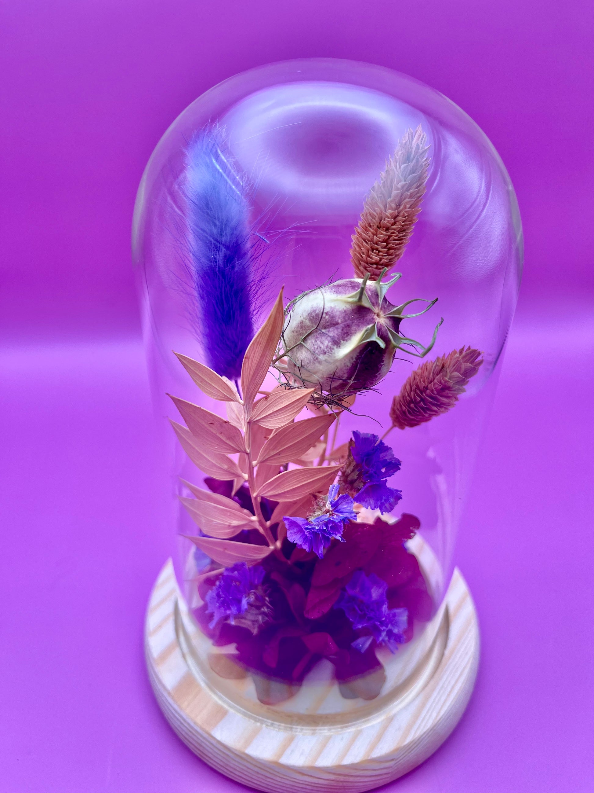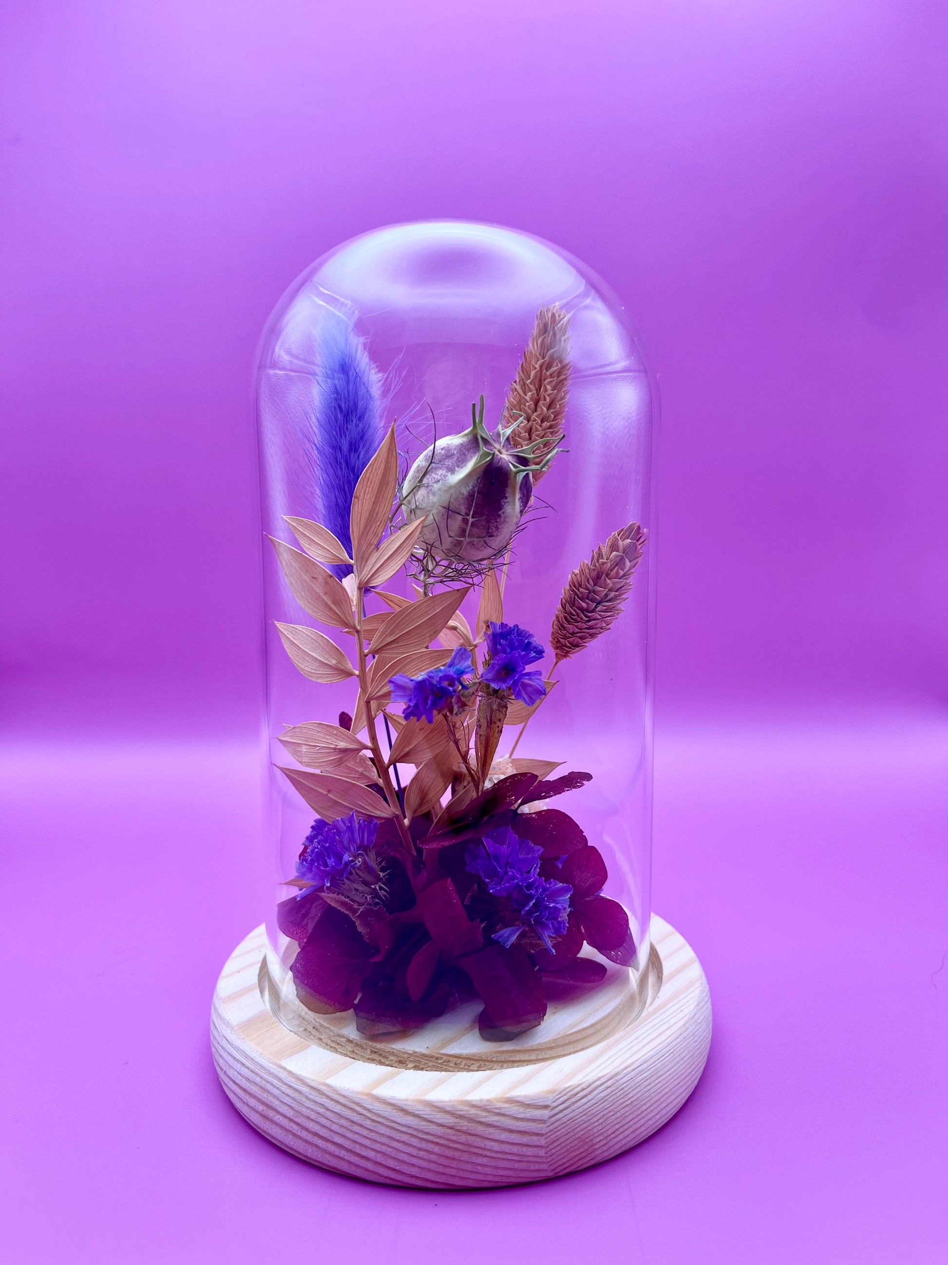 Cette cloche en verre, ornée de fleurs et feuillages séchés dans des tons chaleureux. Elle apportera une touche de douceur et de gaieté à votre intérieur, tout en célébrant la beauté de la nature.