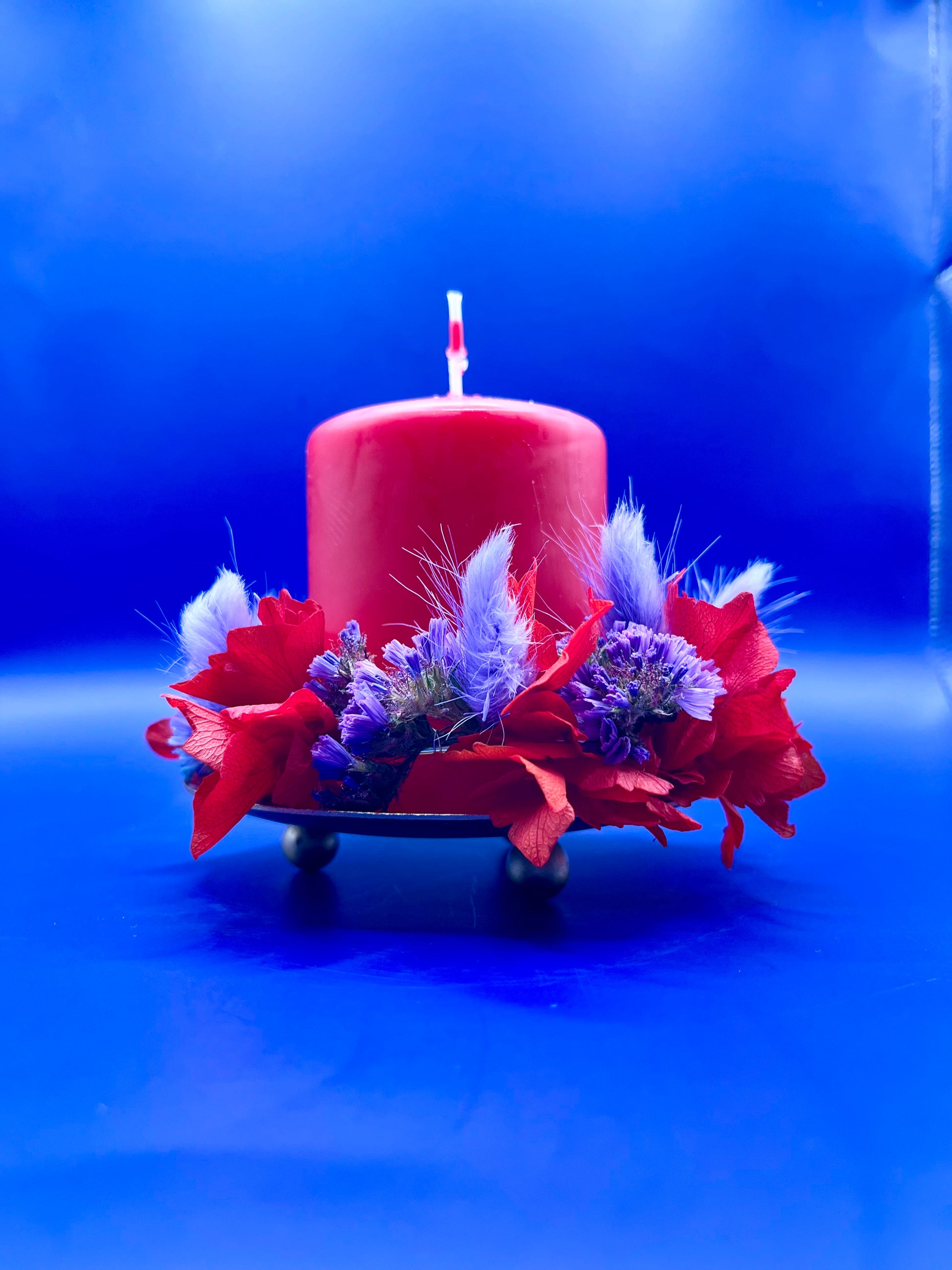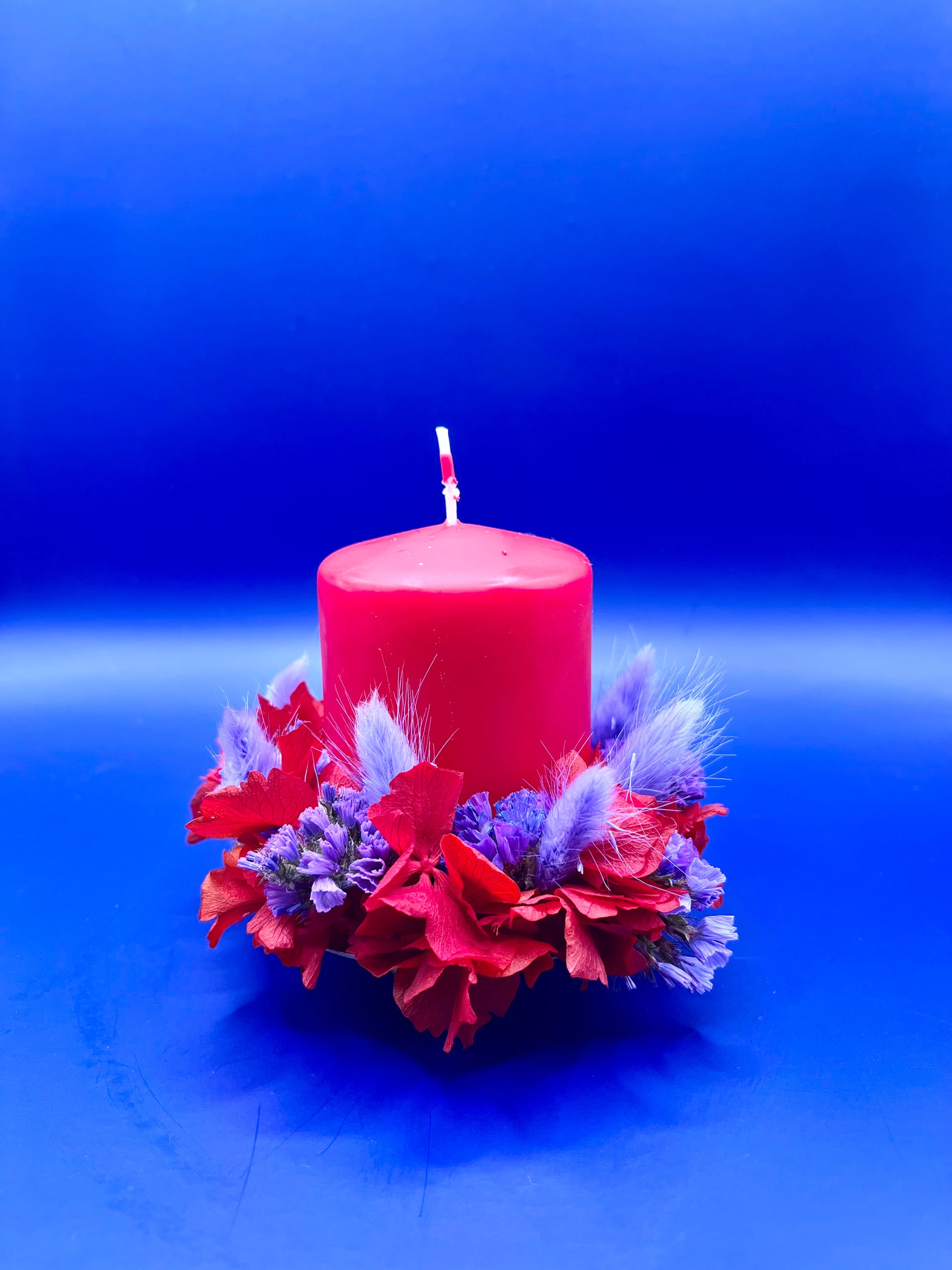 Ce bougeoir délicatement enveloppé d’une couronne de fleurs séchées dans les tons rouge et violet, une pièce unique qui apportera une touche d’élégance et de douceur à votre intérieur.