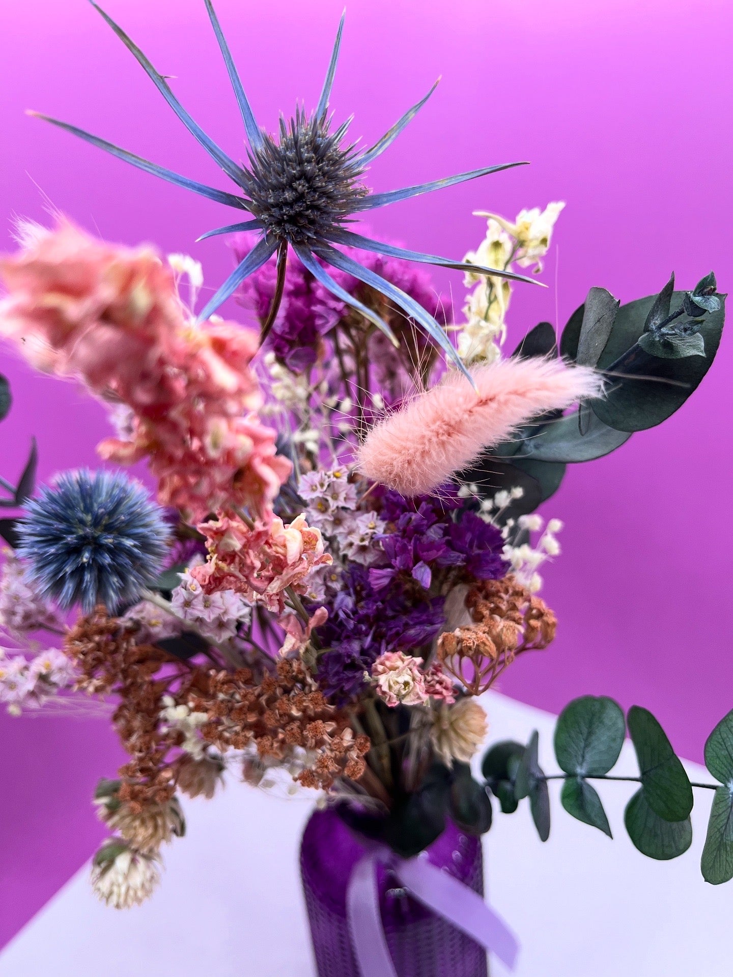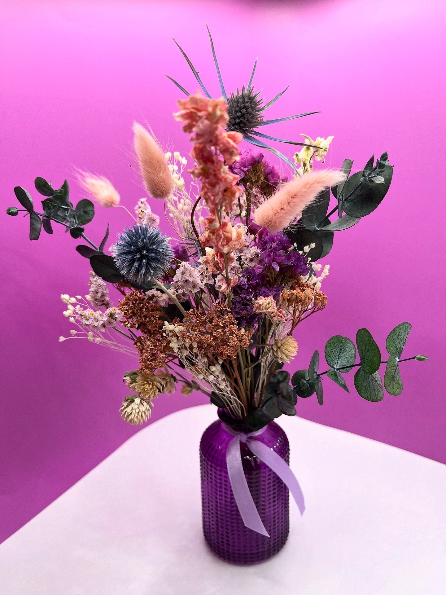 Ce bouquet de fleurs et de feuillages séchés est composé d’un joli dégradé dans les tons roses et violets.