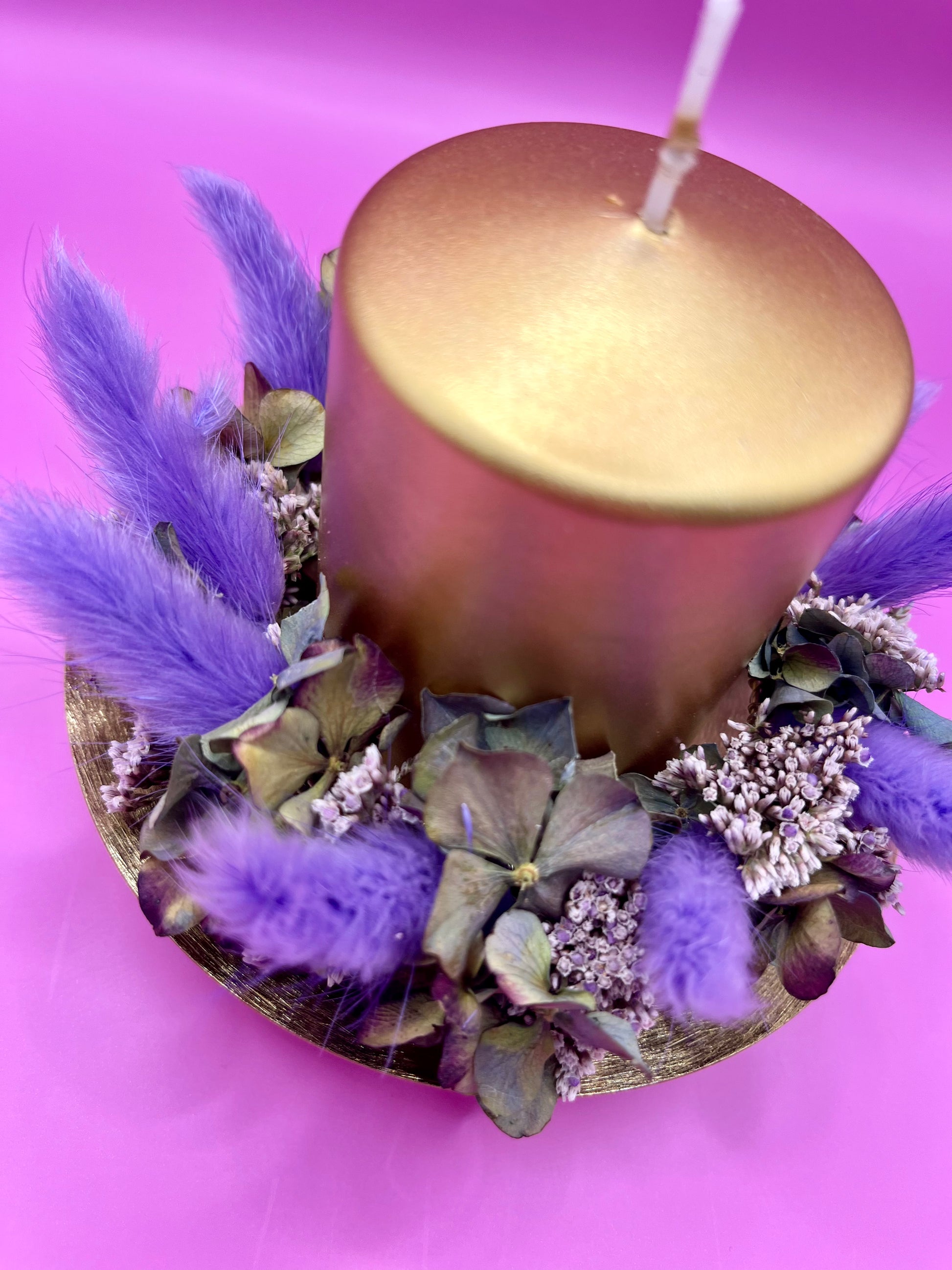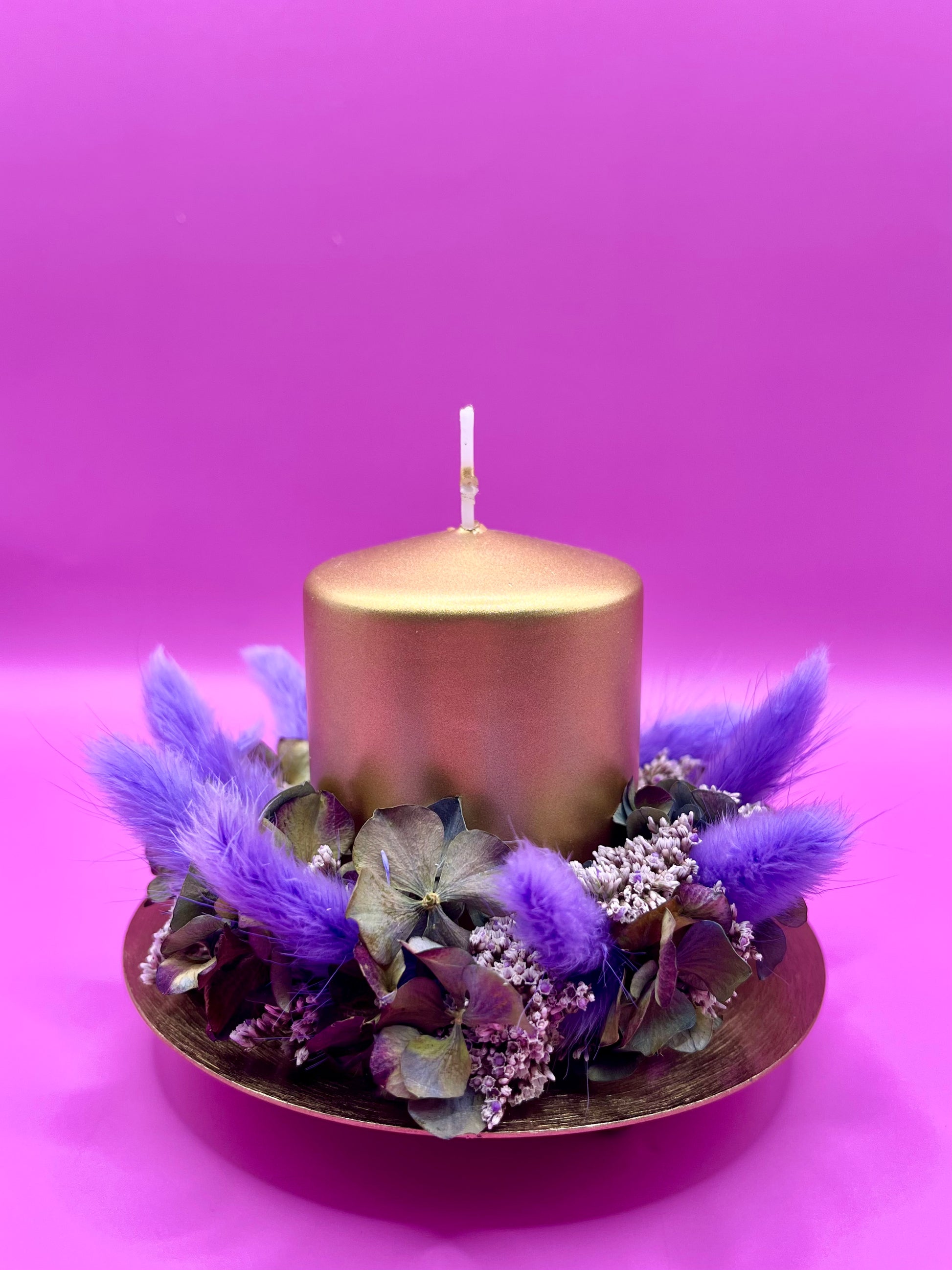 ce bougeoir délicatement enveloppé d’une couronne de fleurs séchées dans les tons bleu-vert et violet, une pièce unique qui apportera une touche d’élégance et de douceur à votre intérieur.