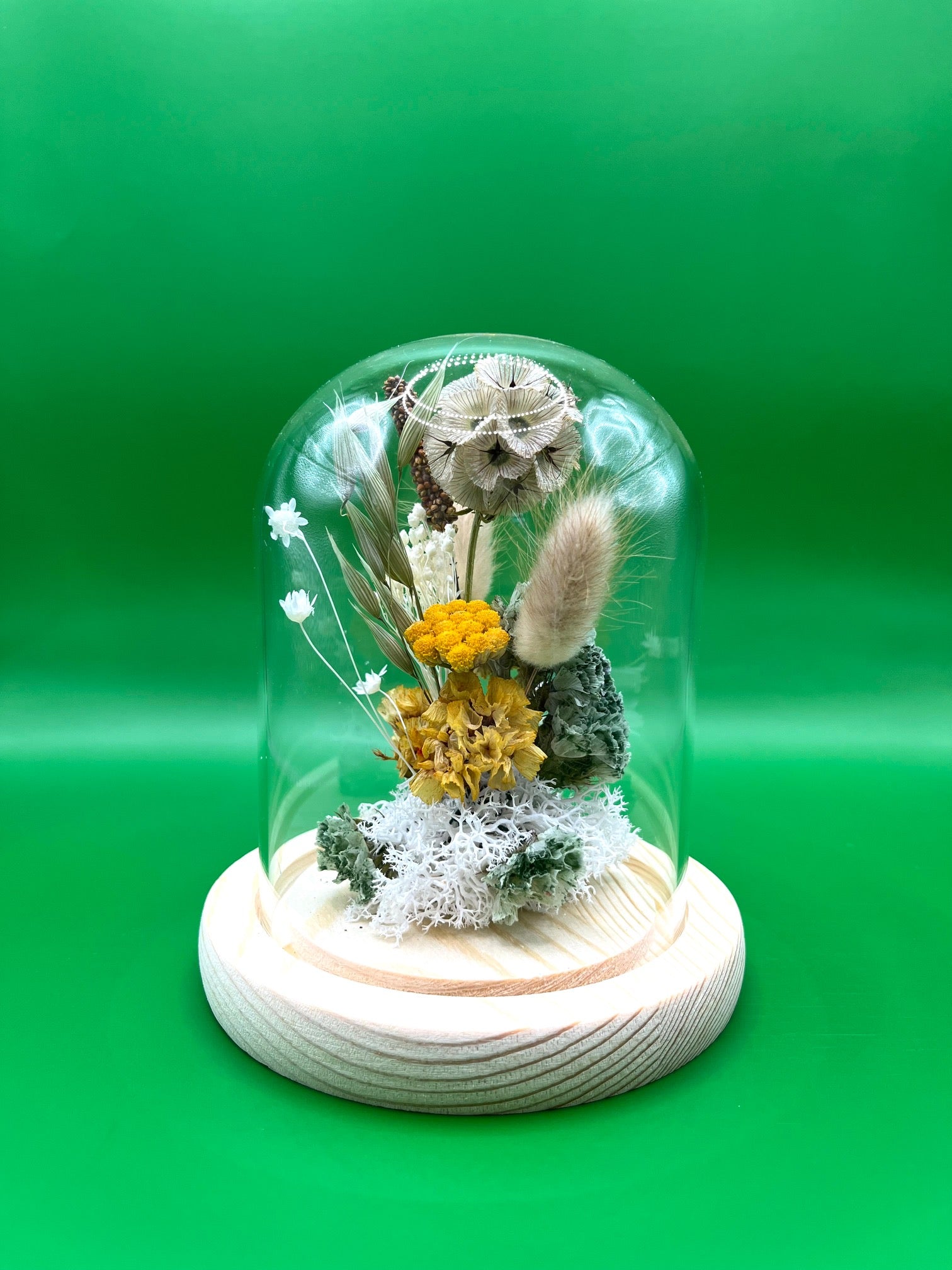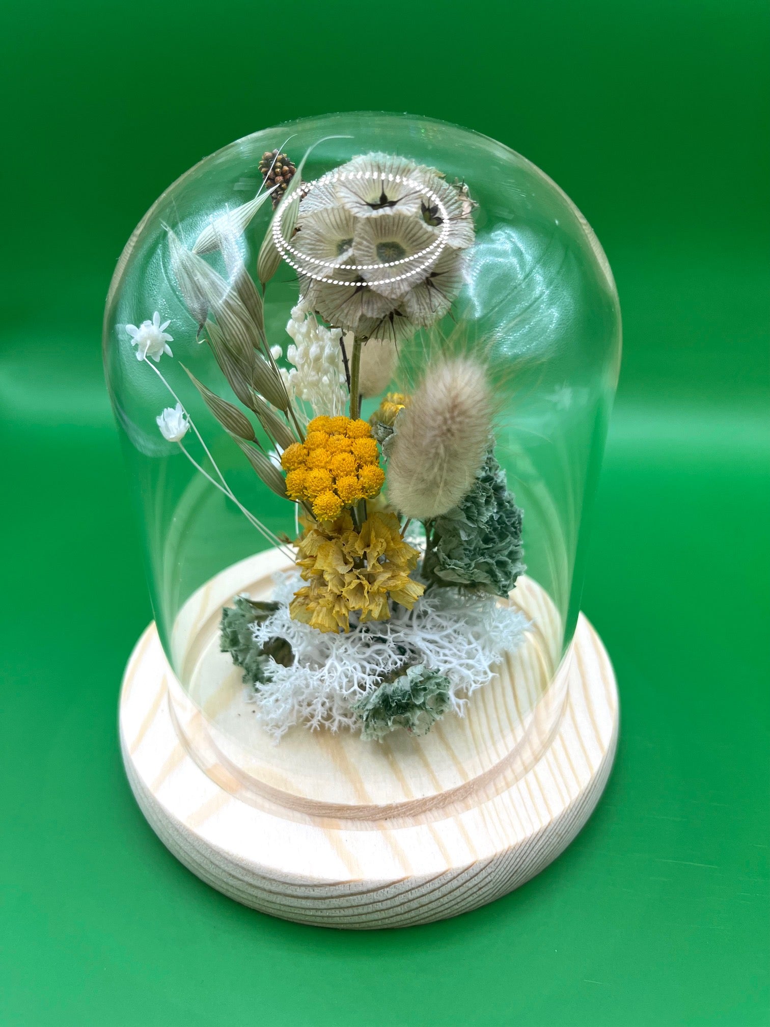Cette cloche en verre, ornée de fleurs et feuillages séchés dans des tons pastel. Elle apportera une touche de douceur et de gaieté à votre intérieur, tout en célébrant la beauté de la nature. Chaque pièce est soigneusement réalisée à la main avec amour dans mon atelier, alliant esthétique et respect de l’environnement.