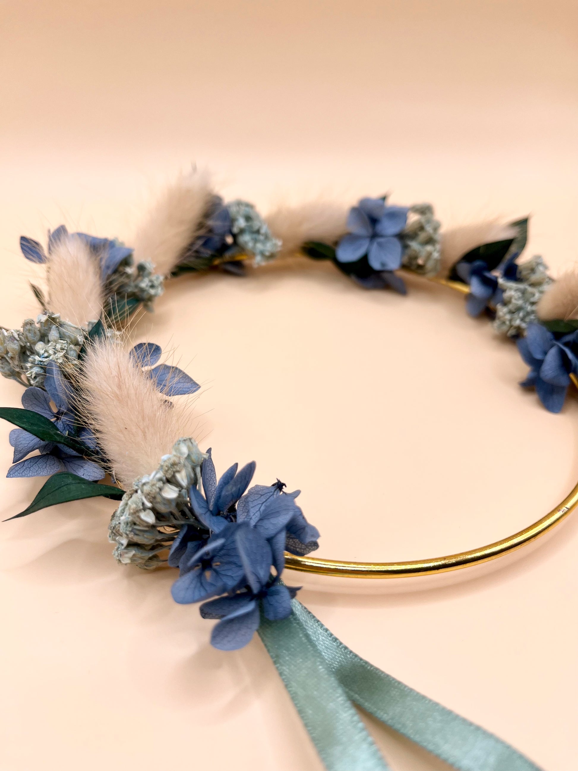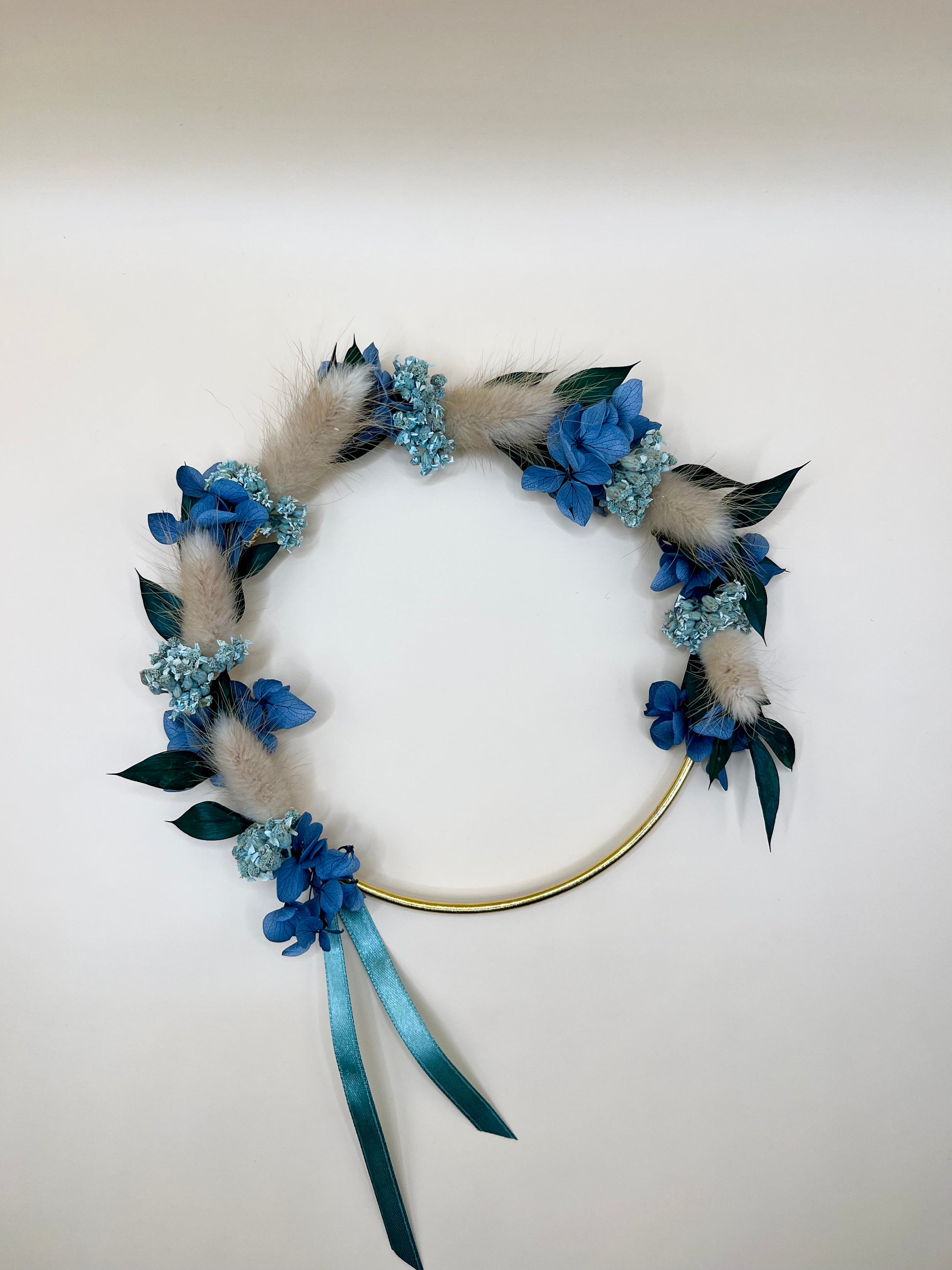 Cette couronne mural en laiton délicatement fleurie, est ornée de fleurs et de feuillages séchés dans des tons apaisants de bleu et de beige.