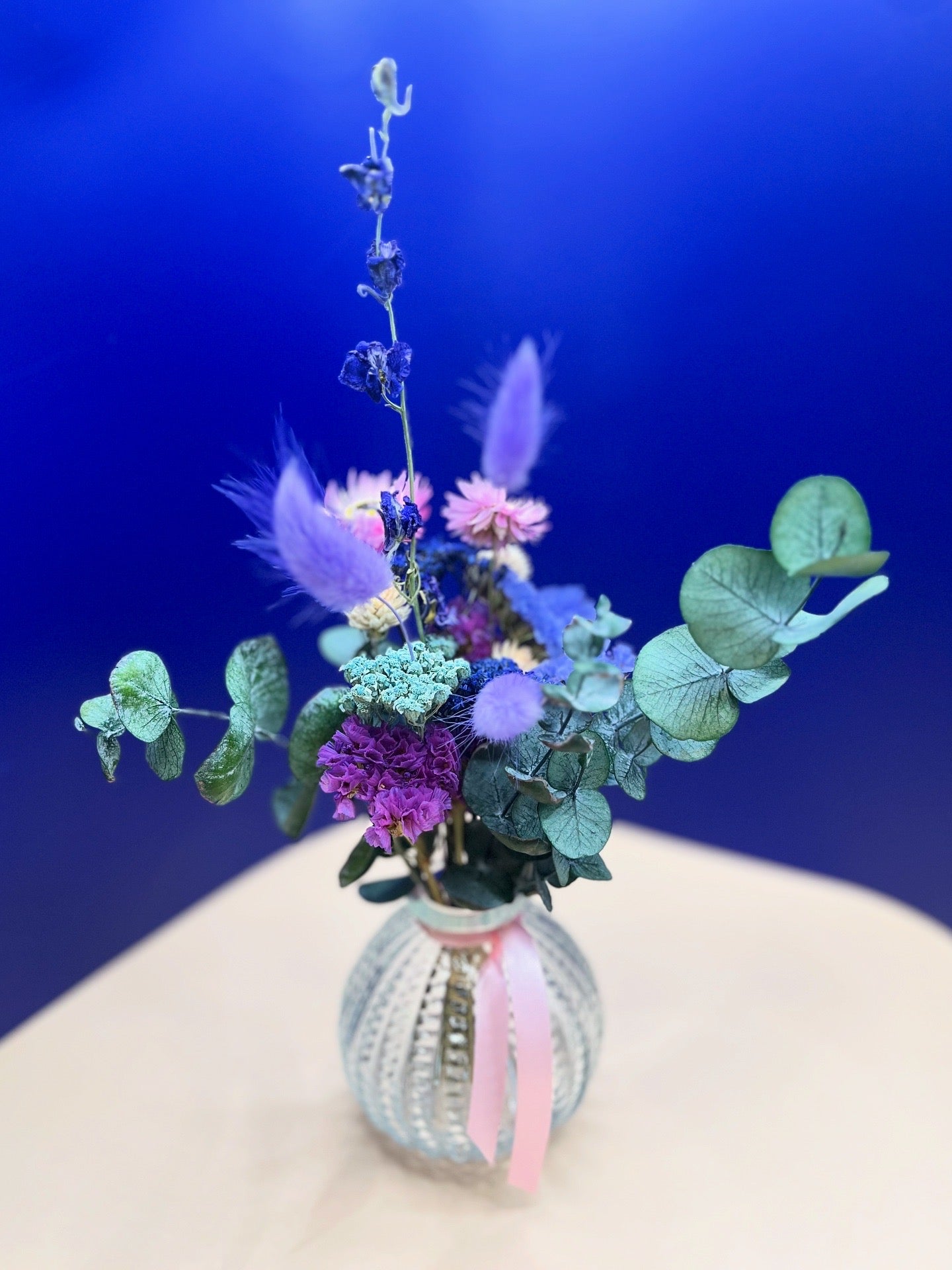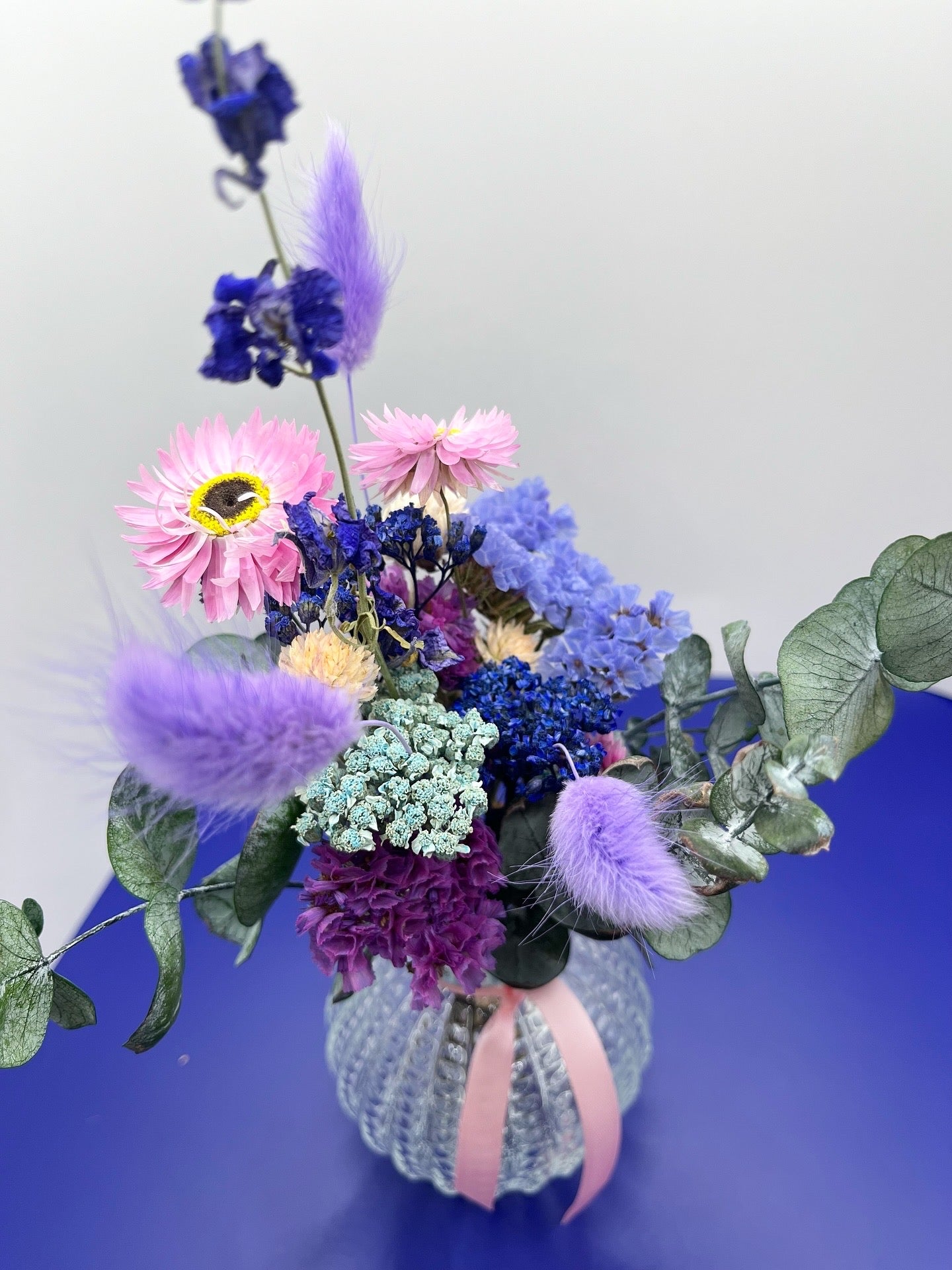 Ce bouquet de fleurs et de feuillages séchés est composé d’un délicat camaïeu de violet.