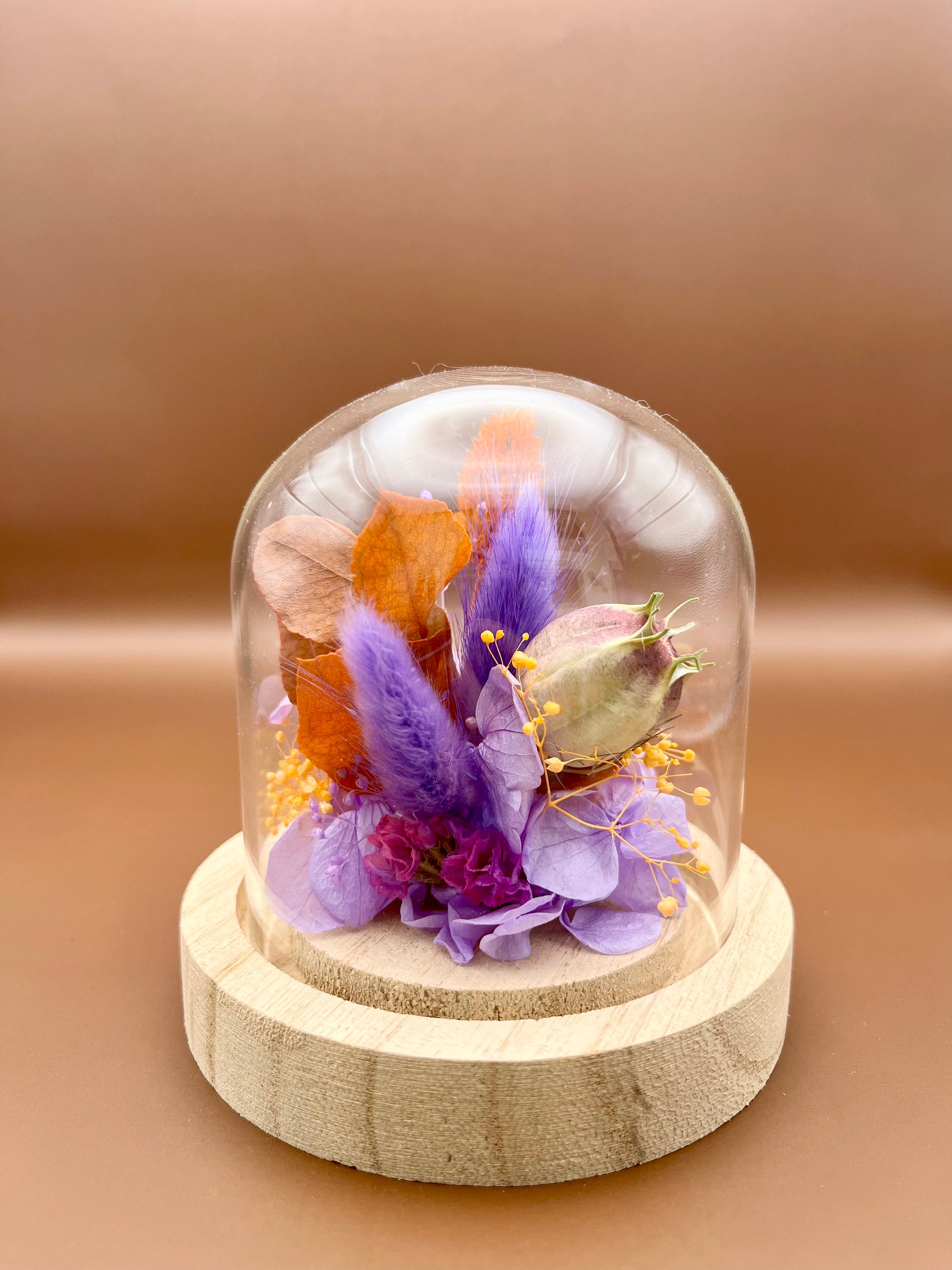 Cette cloche en verre, ornée de fleurs et feuillages séchés dans une joyeuse association de parme et de orange. Elle apportera une touche de douceur et de chaleur à votre intérieur, tout en célébrant la beauté de la nature.