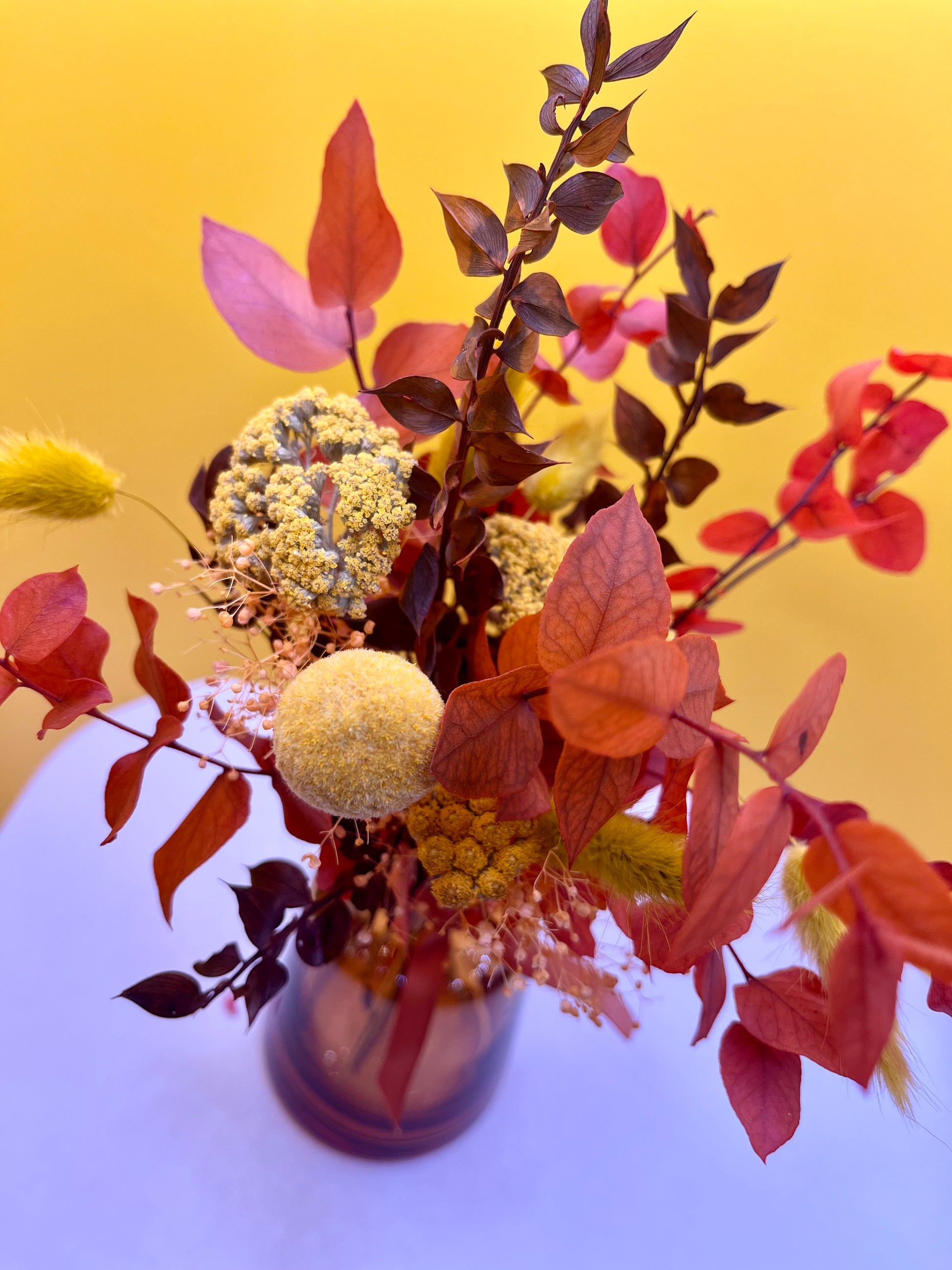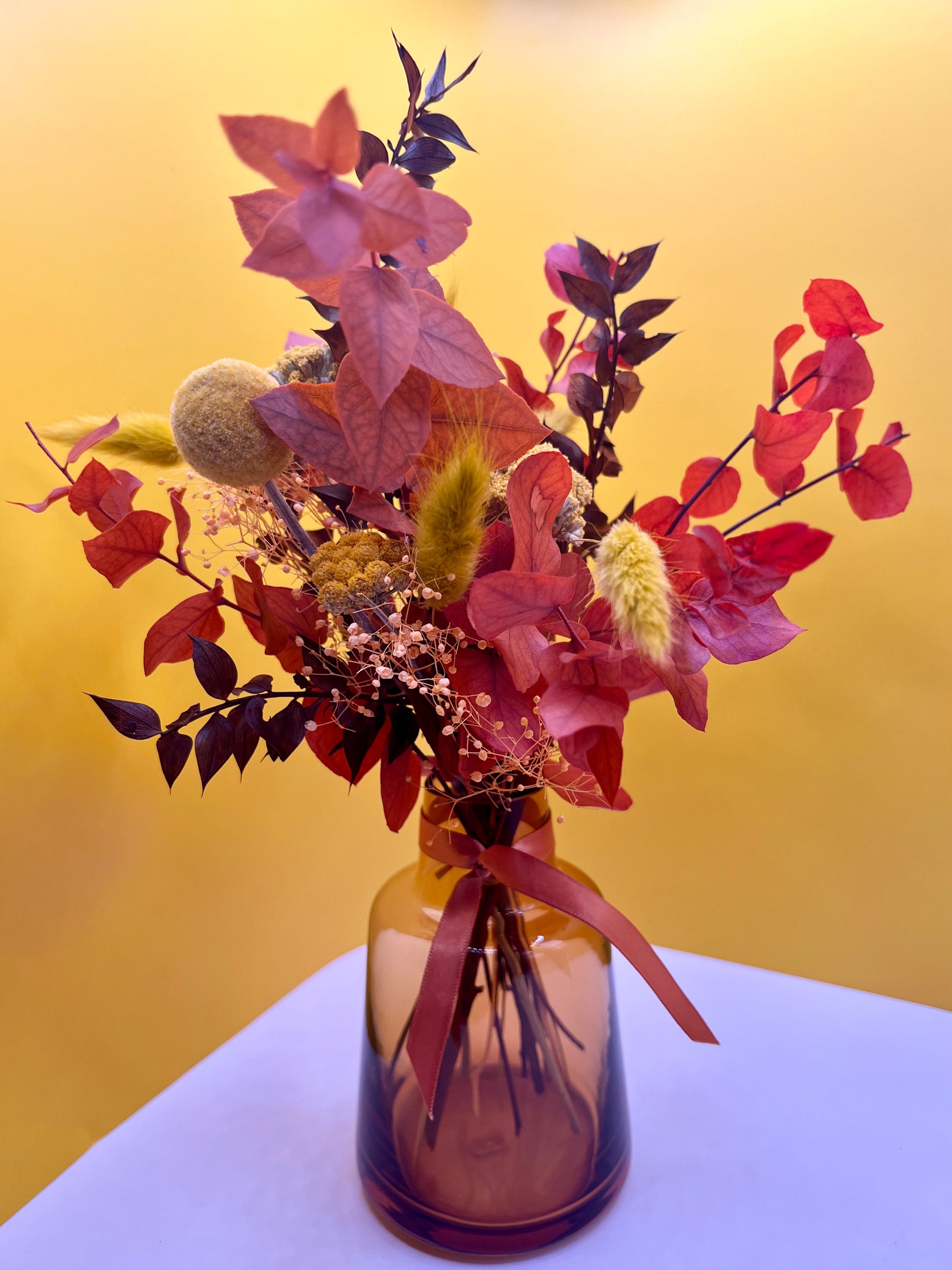Ce bouquet de fleurs et de feuillages séchés est délicatement composé dans des tons chaleureux de orange, de brun et de jaune. Une belle harmonie de couleurs !