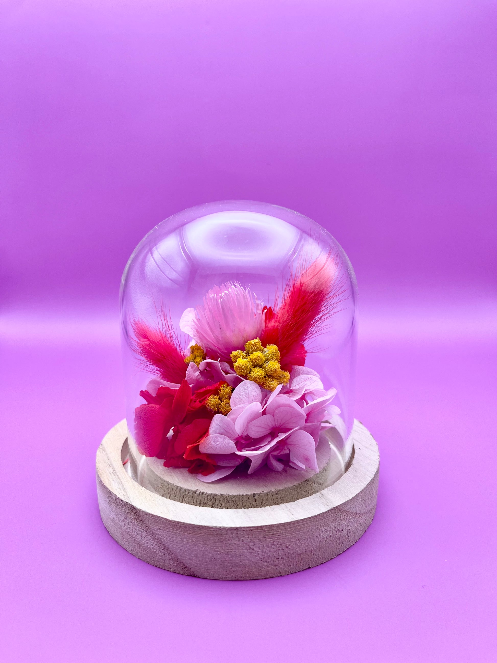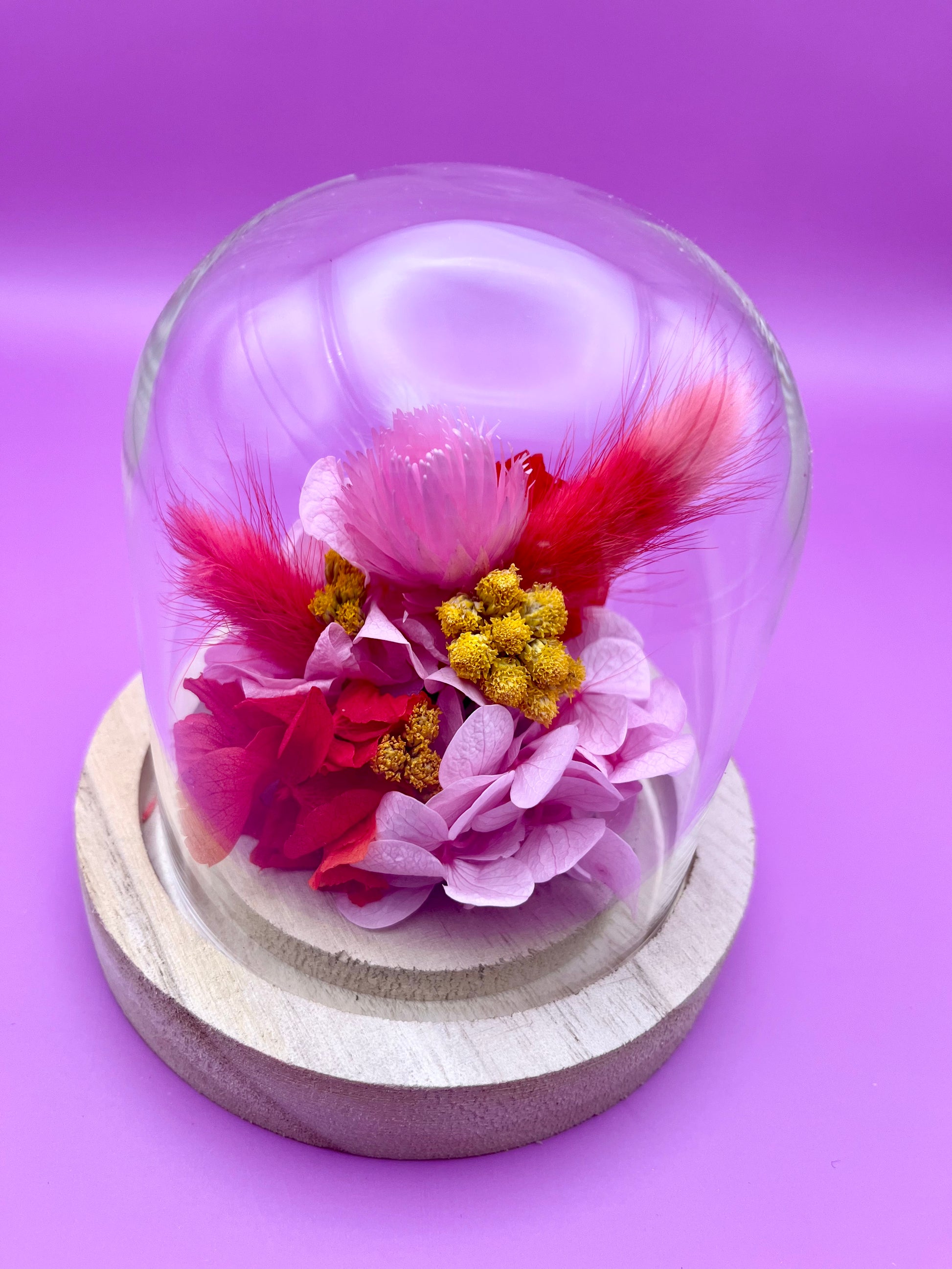 Cette cloche en verre, ornée de fleurs et feuillages séchés dans un camaïeu de roses et une touche de jaune. Elle apportera une touche de douceur et de gaieté à votre intérieur, tout en célébrant la beauté de la nature.