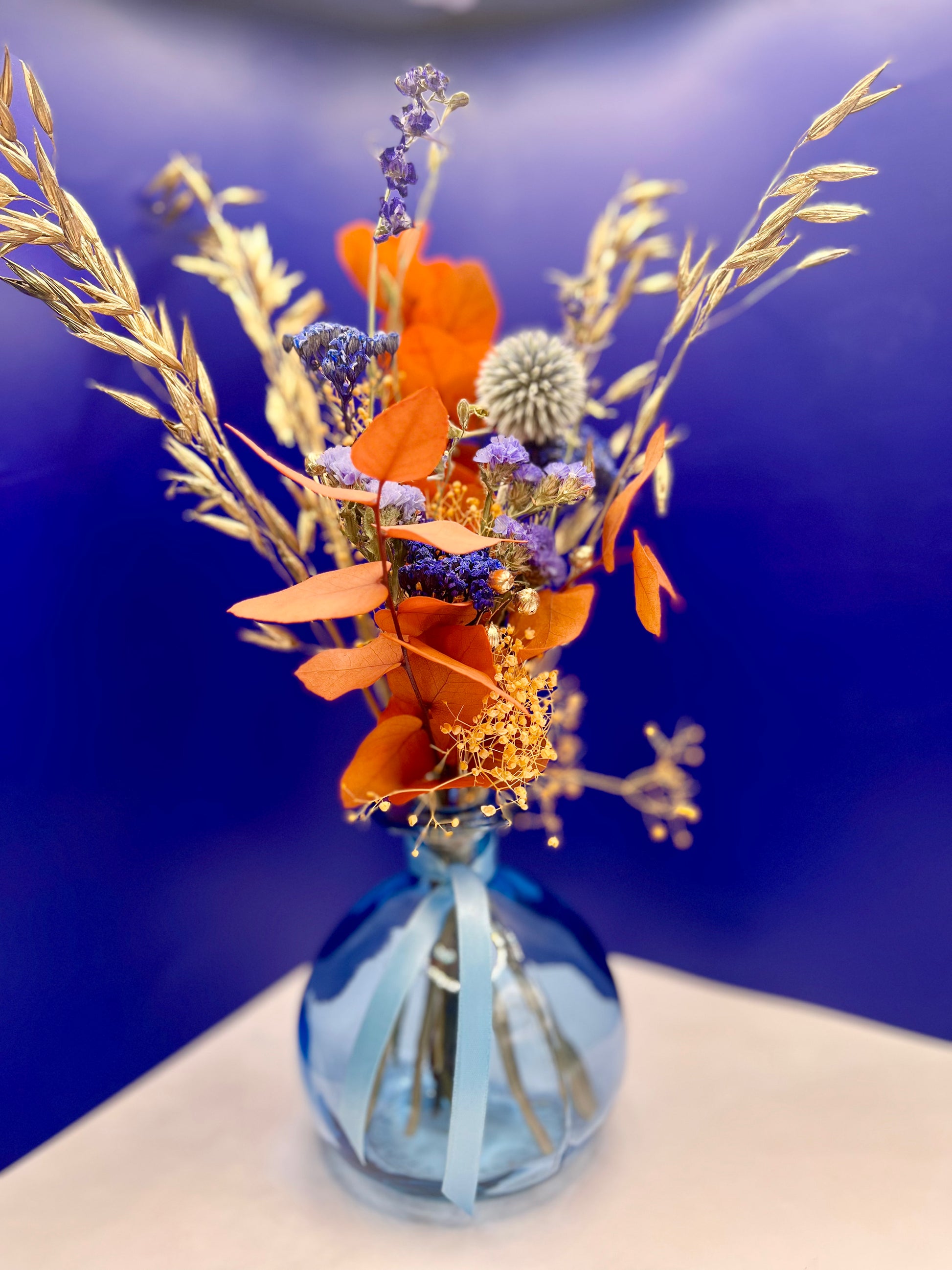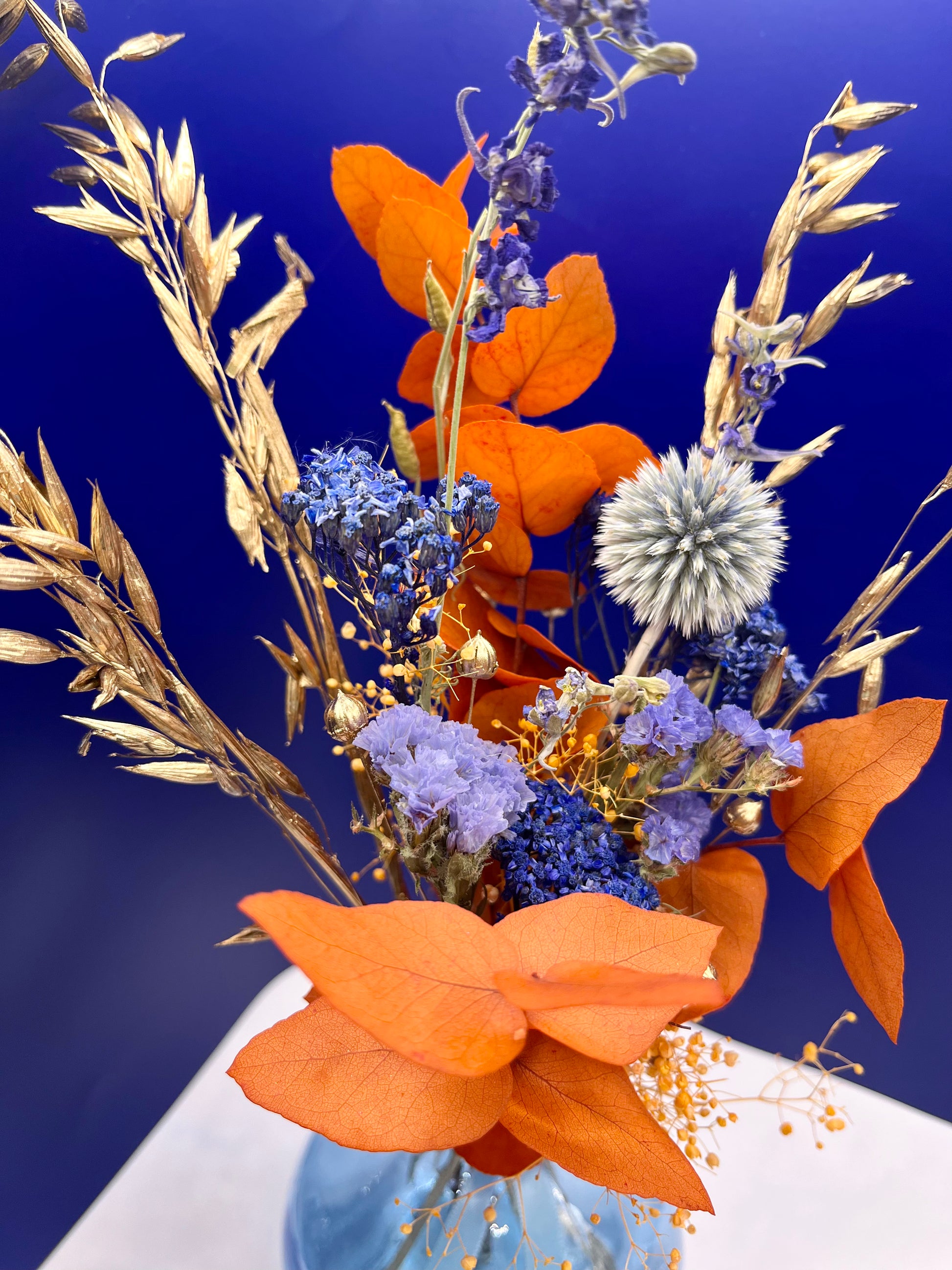 Ce bouquet de fleurs et de feuillages séchés est délicatement composé dans des tons chaleureux de orange, de doré et de bleu. Une belle harmonie de couleurs !