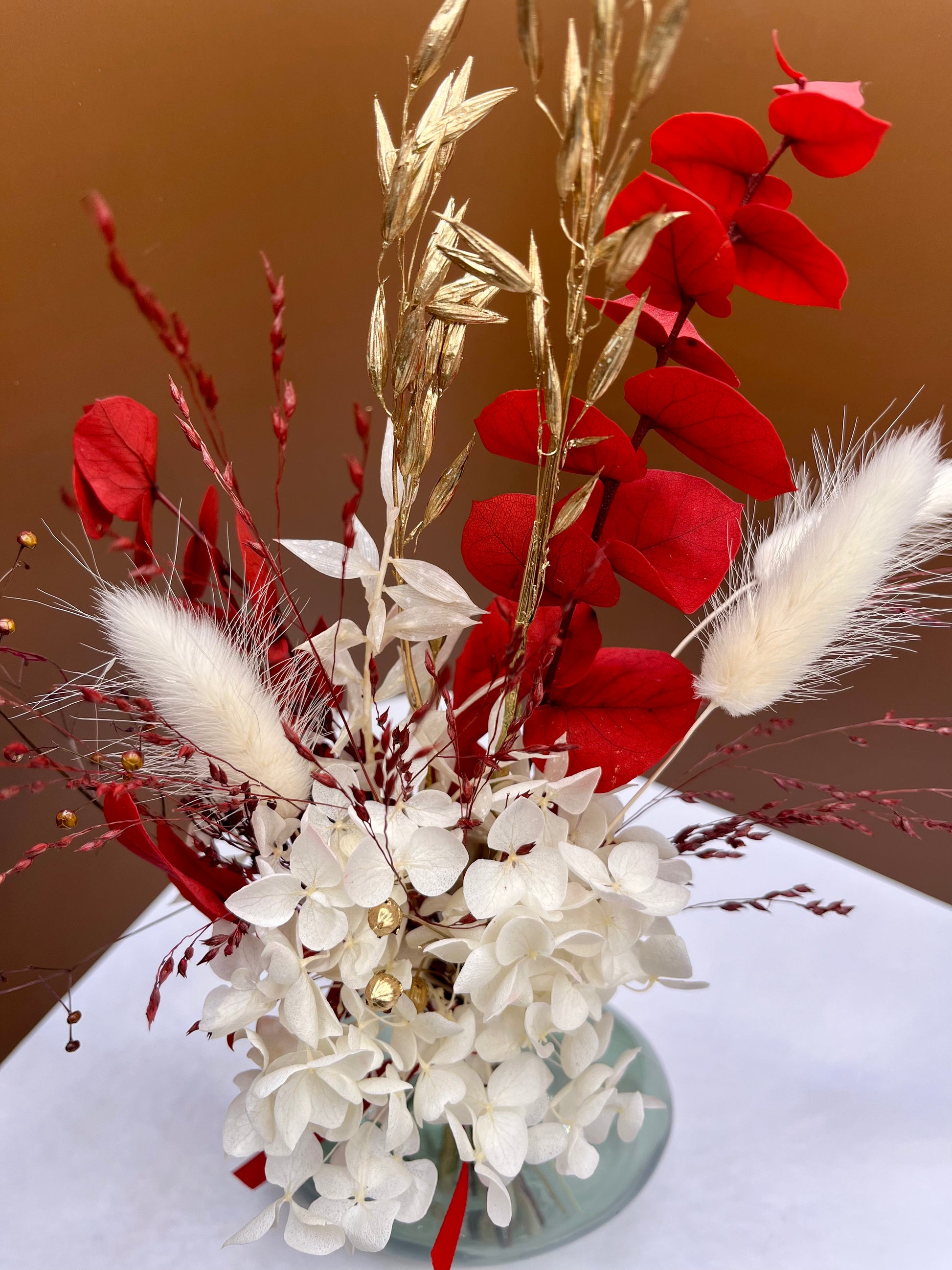 Ce bouquet de fleurs et de feuillages séchés est délicatement composé dans des tons chaleureux de blanc, de doré et de rouge. Une belle harmonie de couleurs !