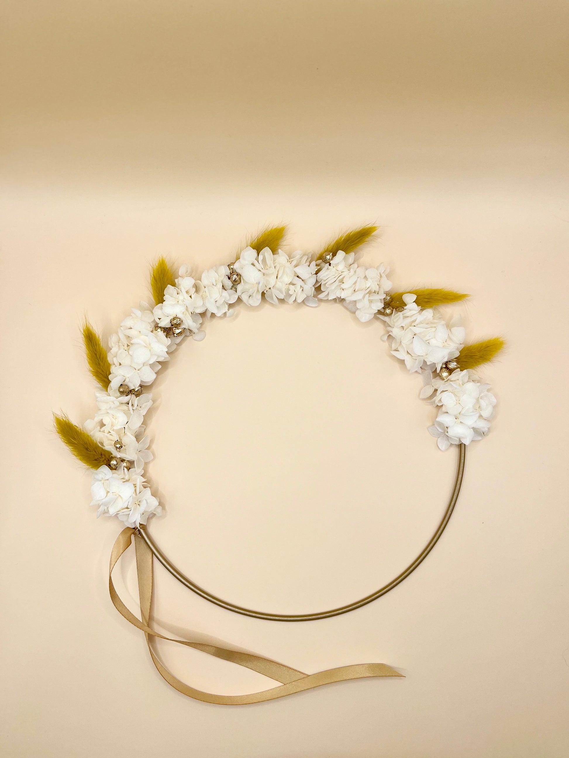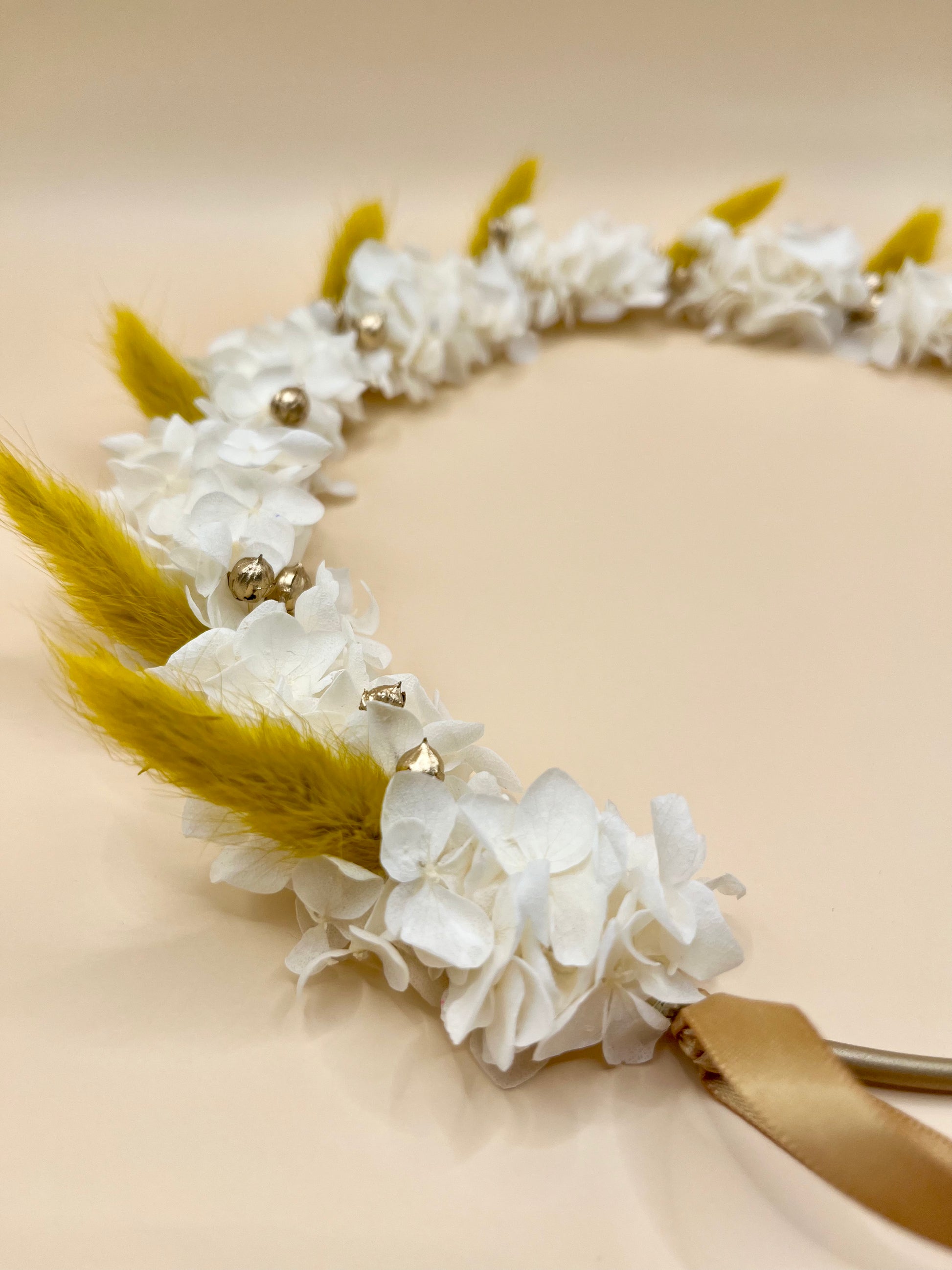 Cette couronne mural en laiton délicatement fleurie, est ornée de fleurs et de feuillages séchés dans des tons de blanc, de doré et de jaune moutarde.