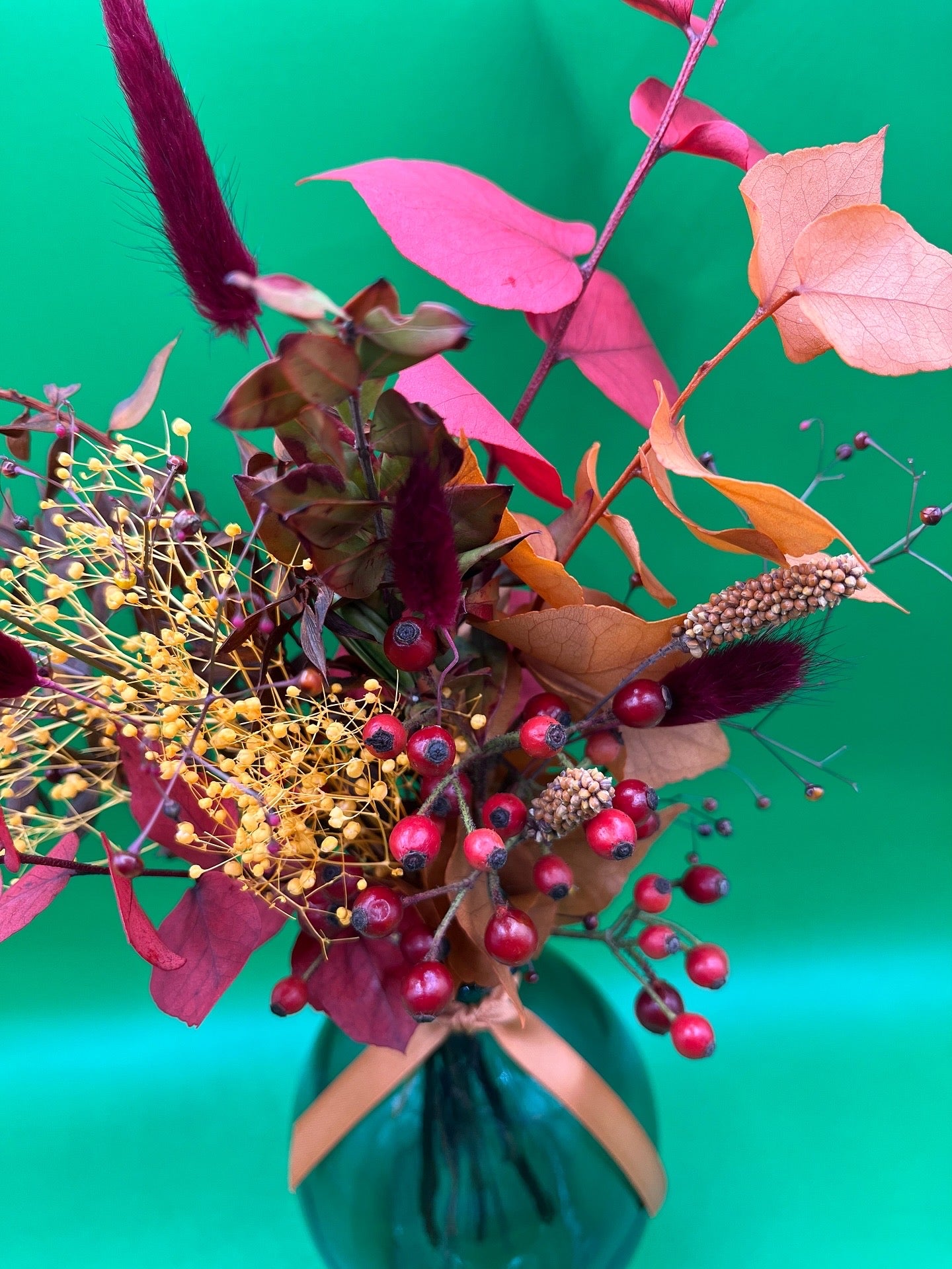 Ce bouquet de fleurs et de feuillages séchés est délicatement composé dans des tons chaleureux de brun, d’ocre et de rouge. Une belle harmonie de couleurs !
