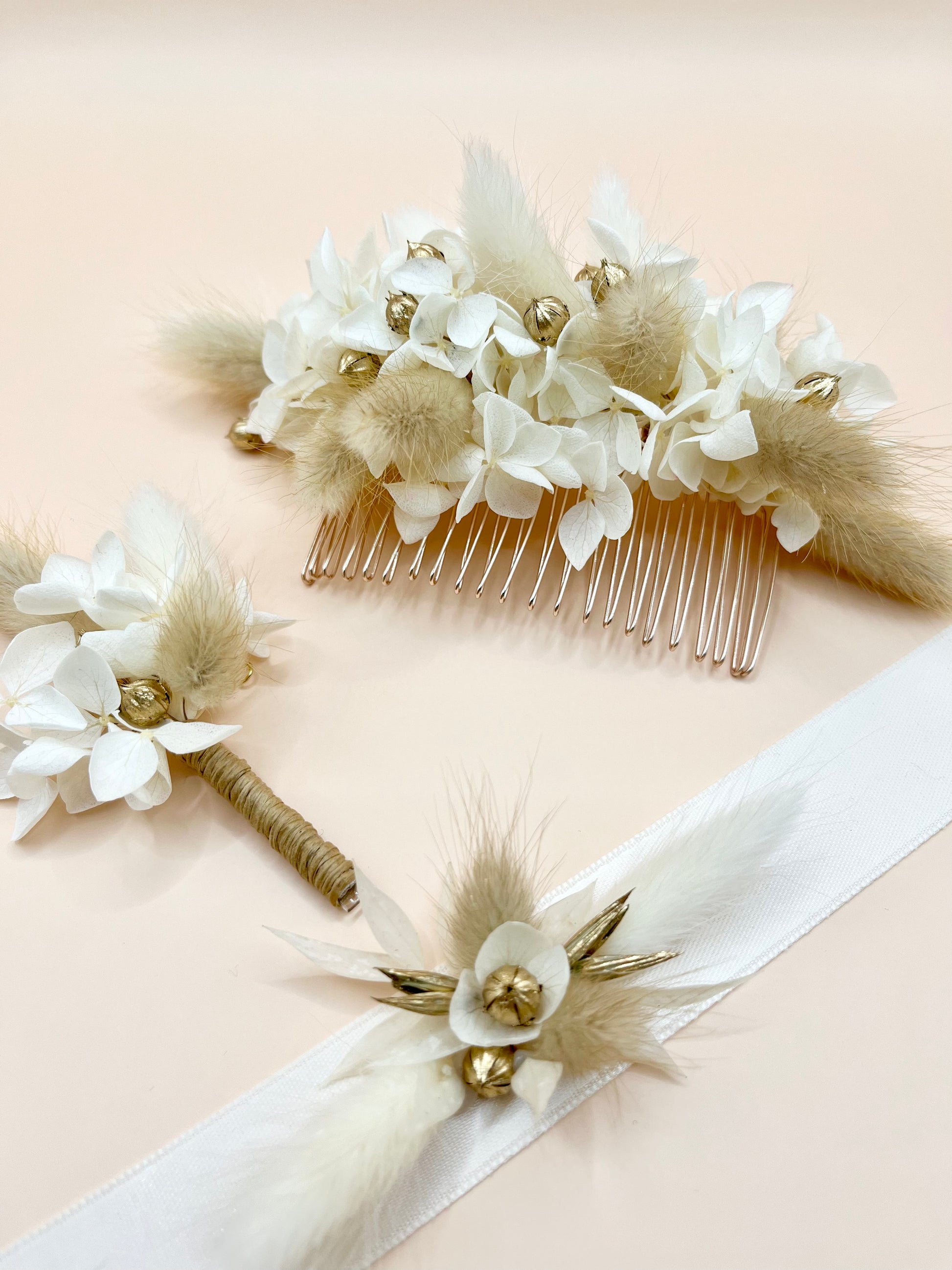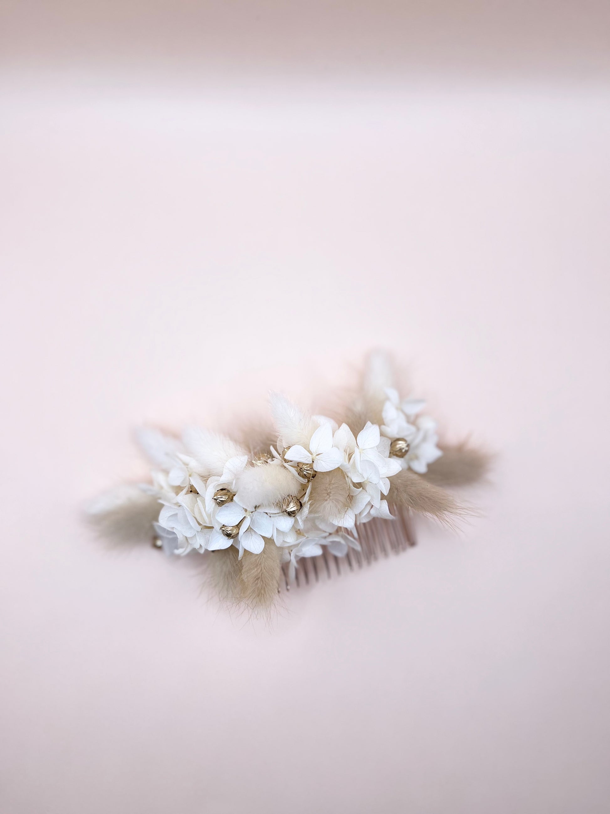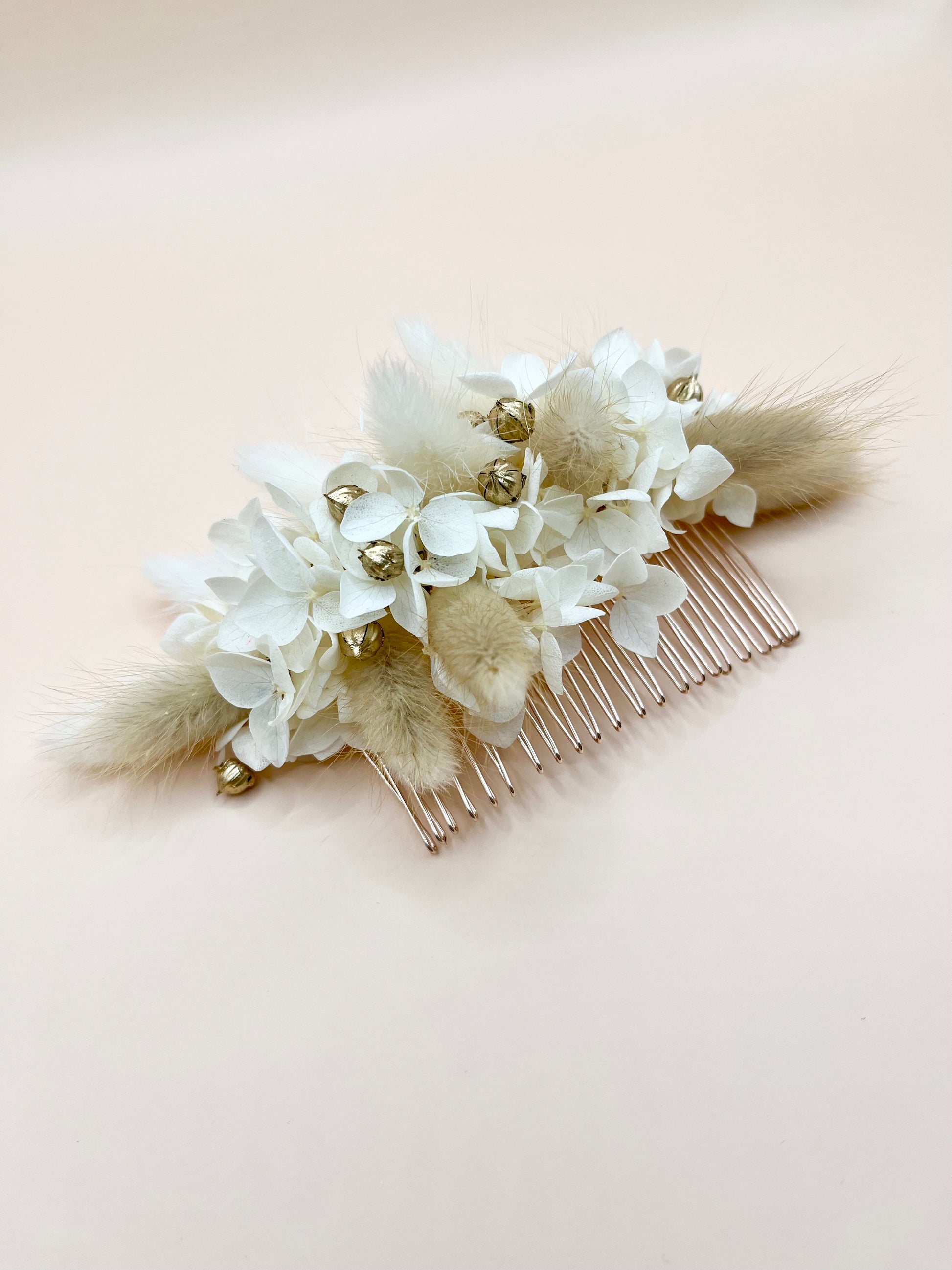 Ce peigne de mariée en fleurs feuillages séchés est délicatement composé dans des tons doux de blanc, beige et dorée.