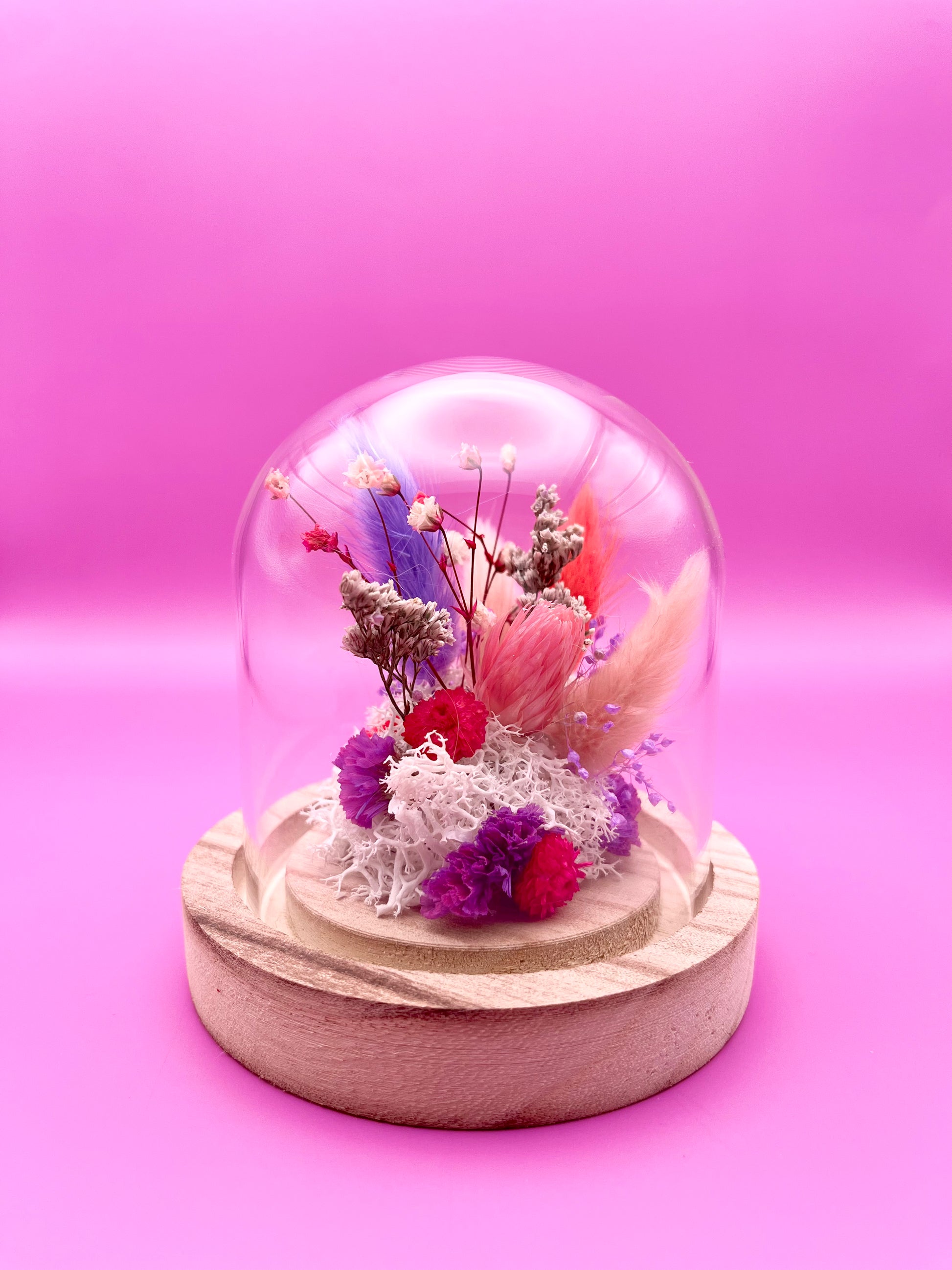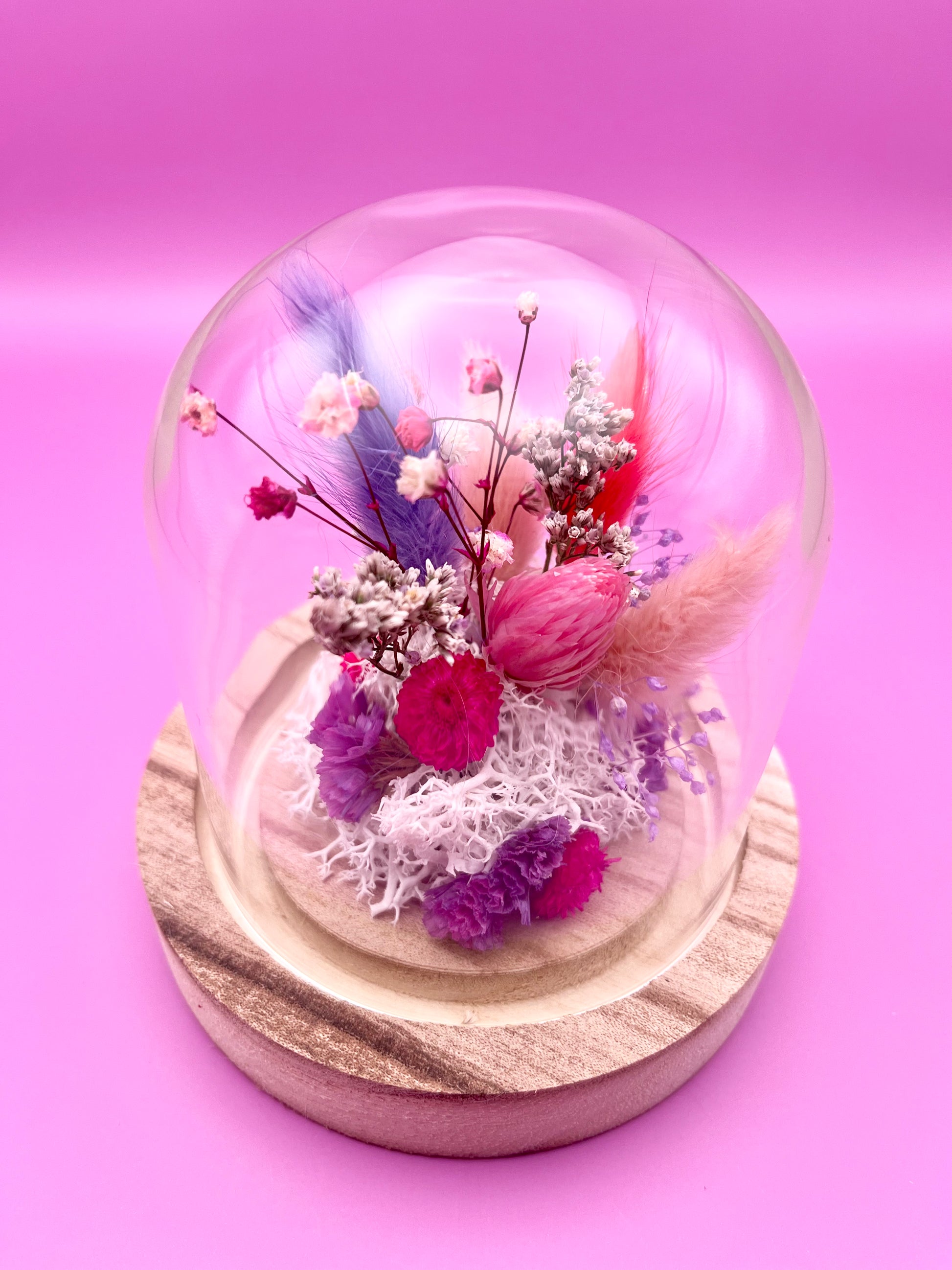 Cette cloche en verre est ornée de fleurs séchés dans un camaïeu de rose et violet. Elle apportera une touche de douceur et de gaieté à votre intérieur, tout en célébrant la beauté de la nature. Chaque pièce est soigneusement réalisée à la main avec amour dans mon atelier, alliant esthétique et respect de l’environnement.