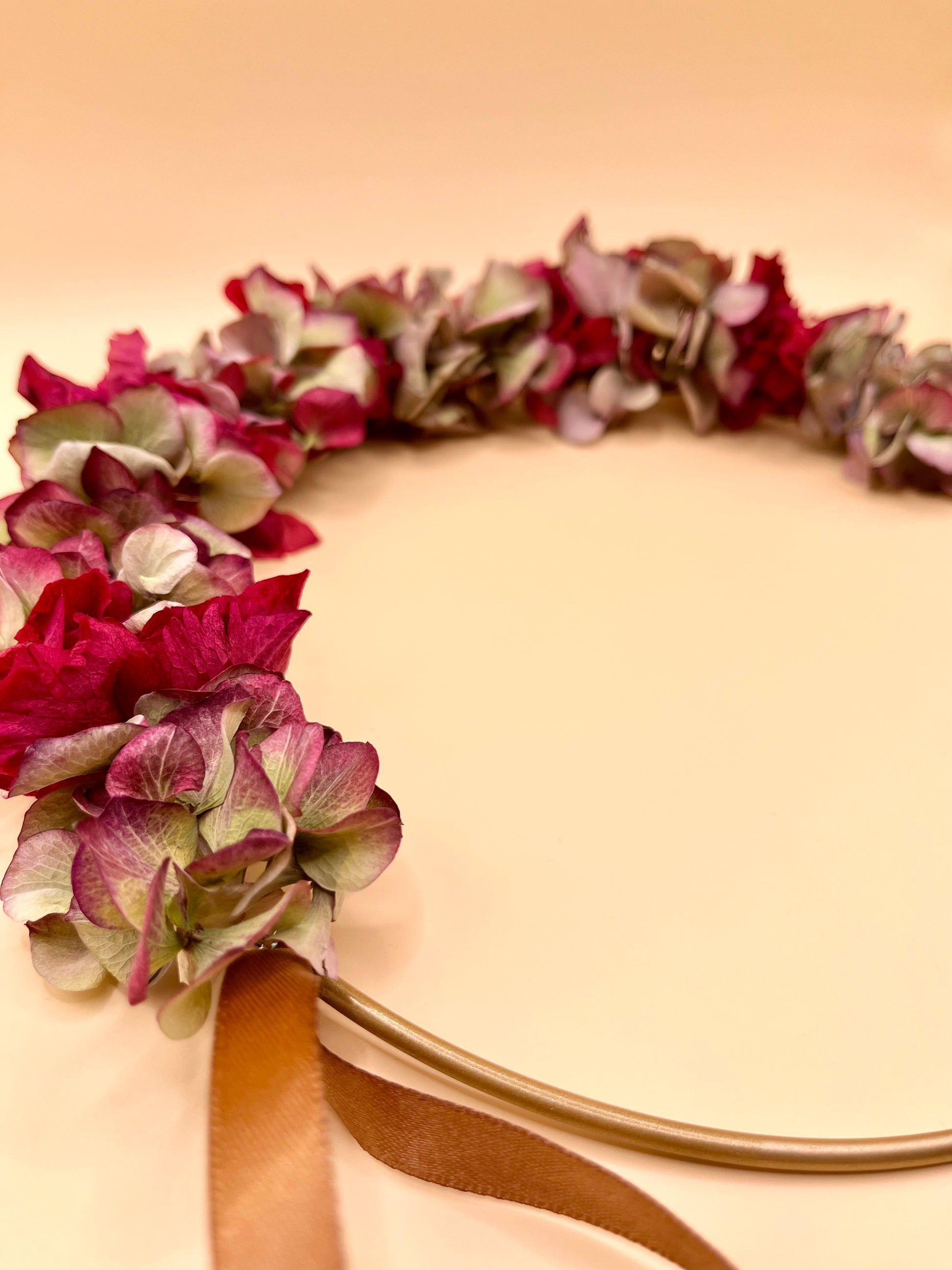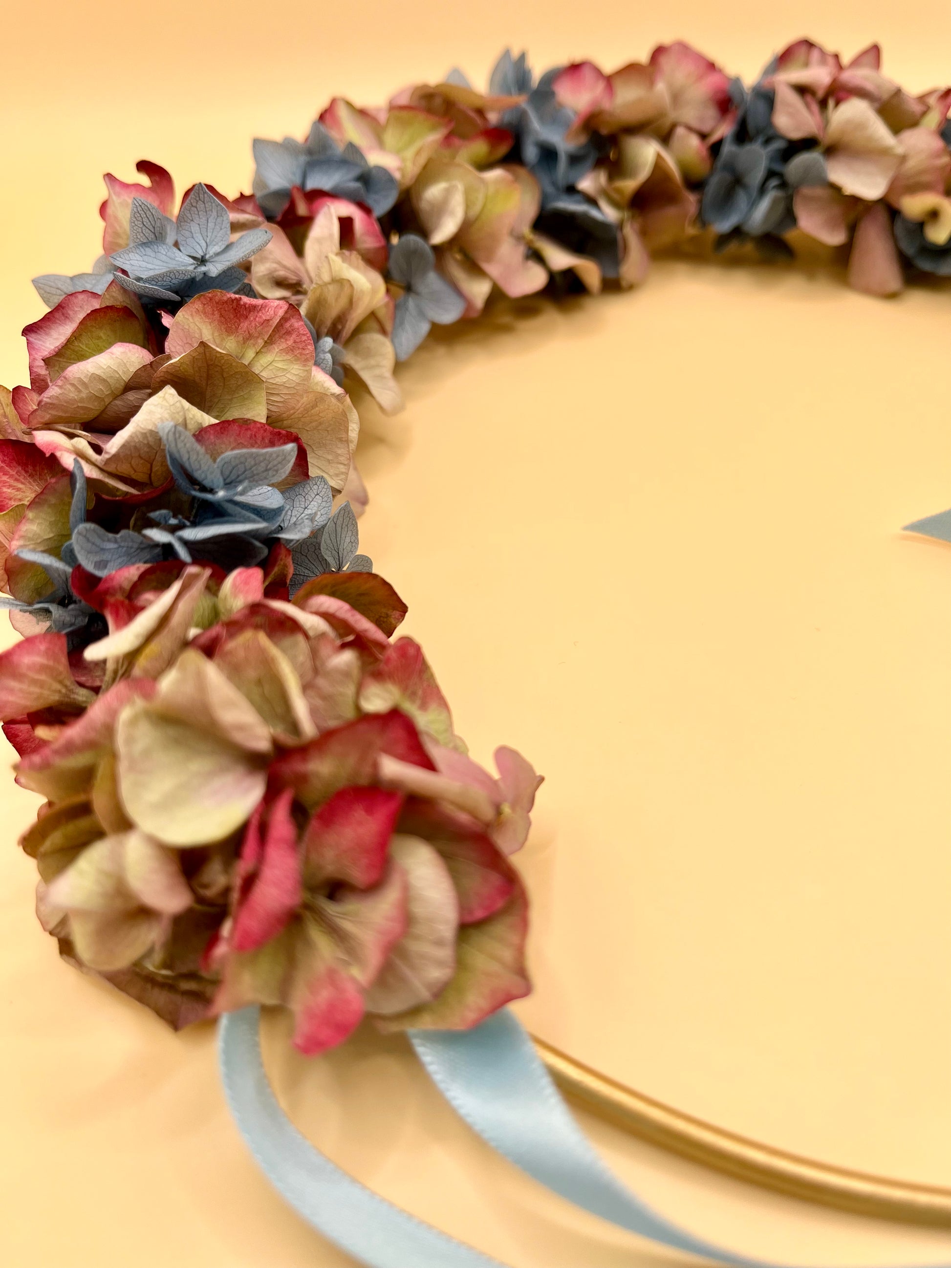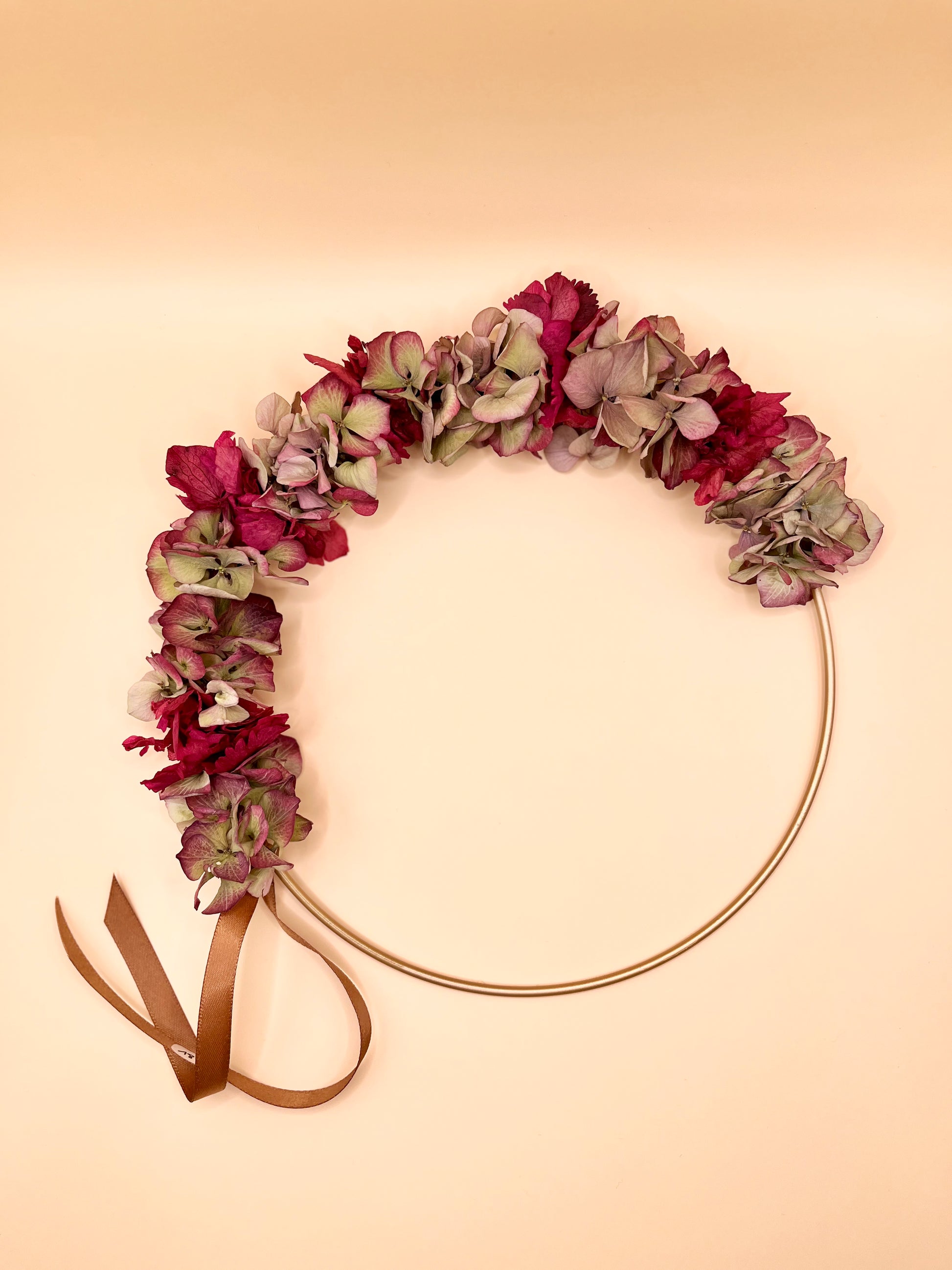 Cette couronne mural en laiton délicatement fleurie, est ornée de fleurs et de feuillages séchés dans des tons apaisants.
