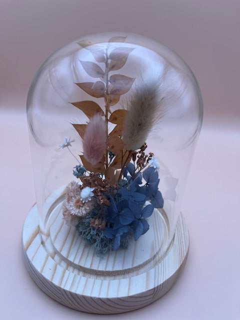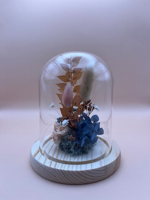 Cette cloche en verre, ornée de fleurs et feuillages séchés dans des tons doux et chaleureux. Elle apportera une touche féérique à votre intérieur, tout en célébrant la beauté de la nature.