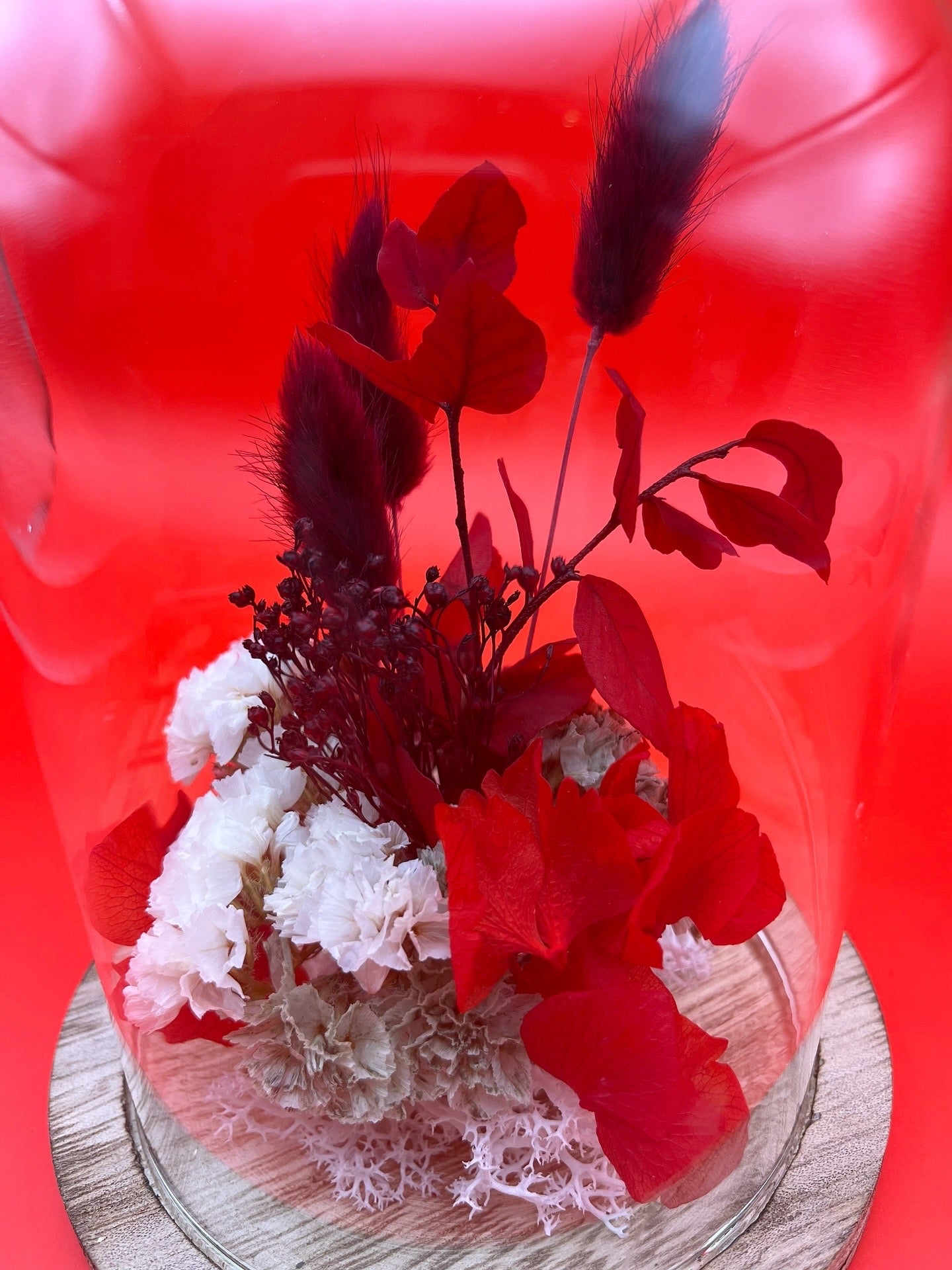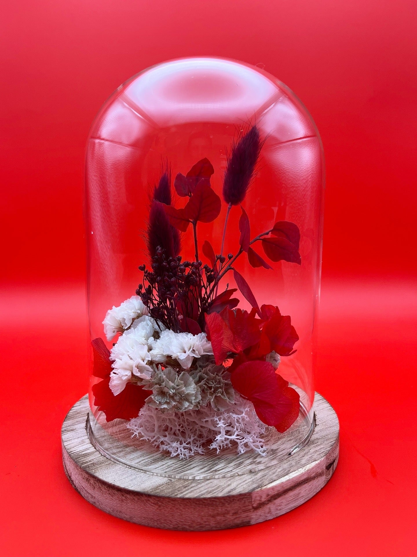 Cette cloche en verre, ornée de fleurs et feuillages séchés dans un dégradé de rouge. Elle apportera une touche chaleureuse à votre décoration de fête, tout en célébrant la beauté de la nature.