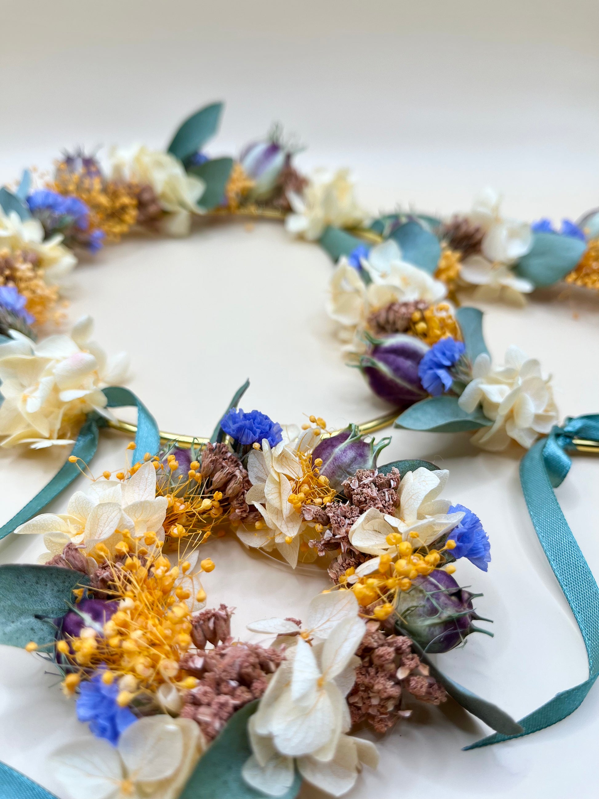 Ces 3 couronnes murales en laiton délicatement fleurie, ornée de fleurs et de feuillages séchés dans les tons jaune, bleu et vert.
