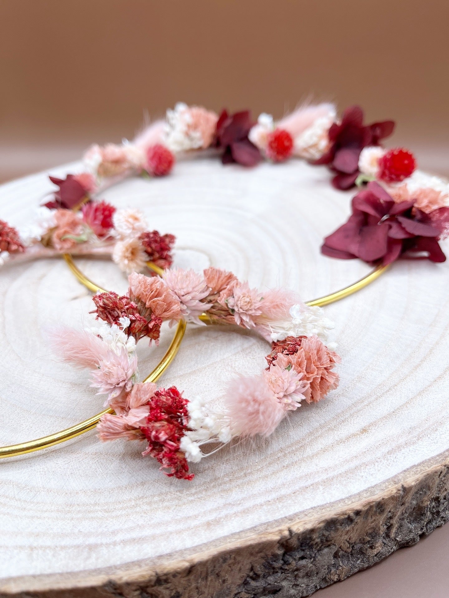 Ces 3 couronnes murales en laiton délicatement fleuries, ornée de fleurs et de feuillages séchés dans un camaïeu de rose.