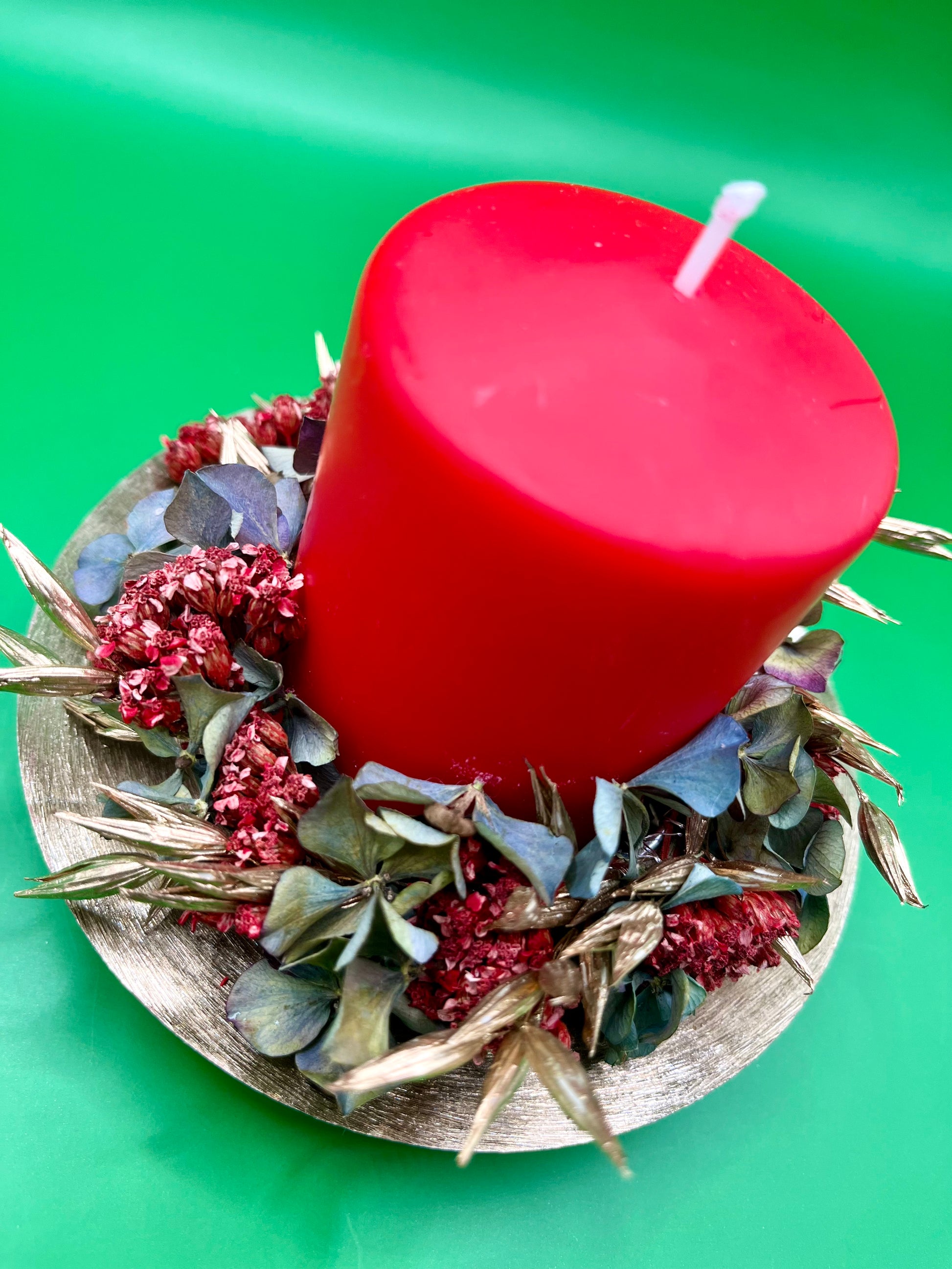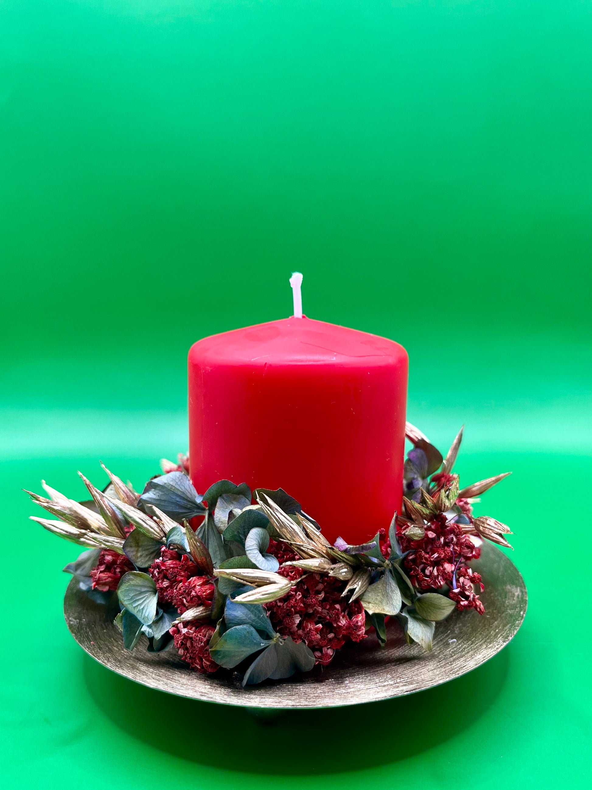Ce bougeoir délicatement enveloppé d’une couronne de fleurs séchées dans les tons bleu-vert, rouge et dorée, une pièce unique qui apportera une touche d’élégance et de douceur à votre intérieur.