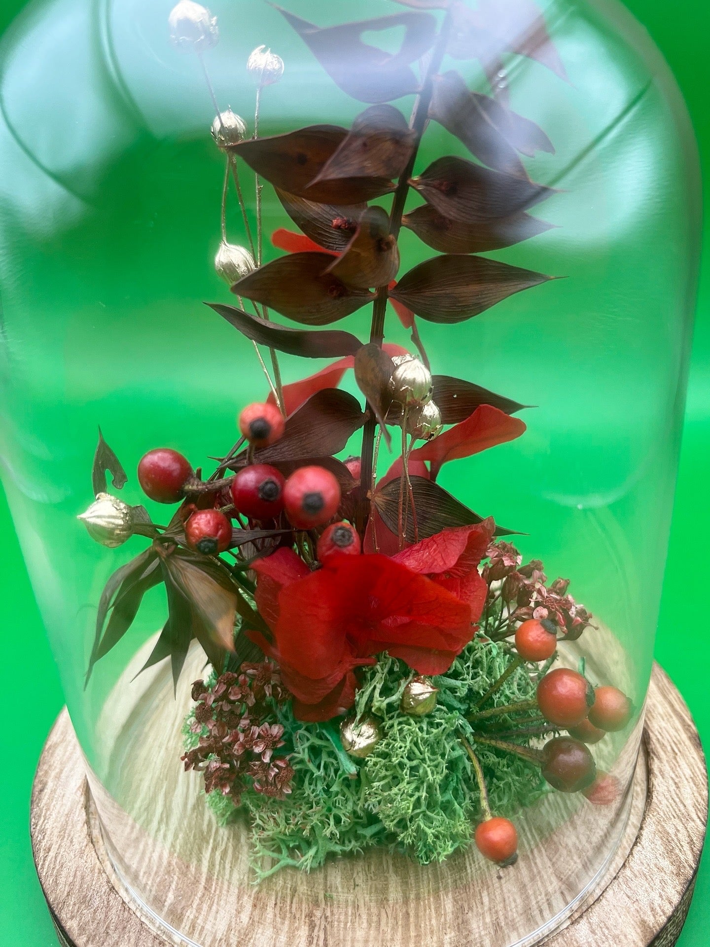 Cette cloche en verre, ornée de fleurs et feuillages séchés dans un esprit de Noël. Elle apportera une touche chaleureuse à votre intérieur, tout en célébrant la beauté de la nature.